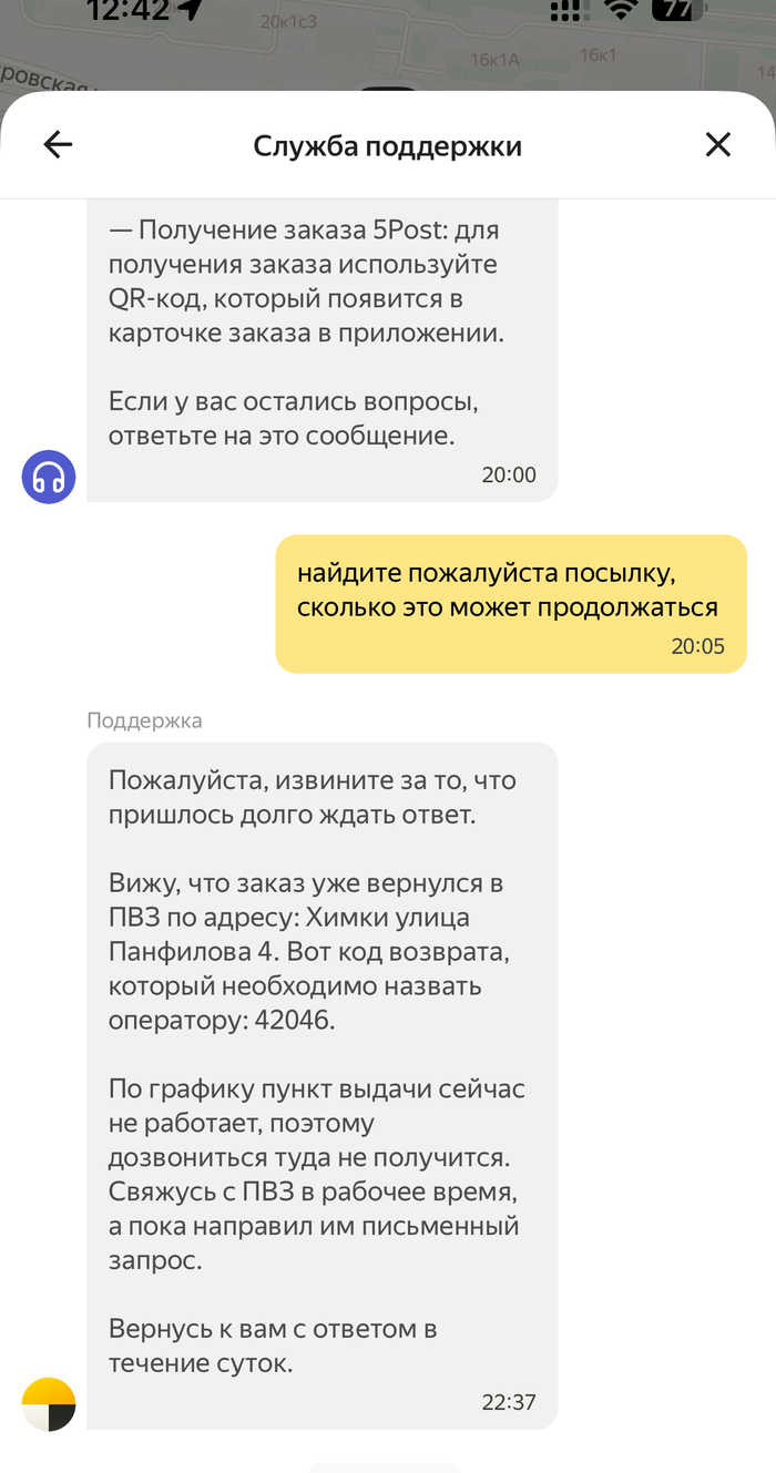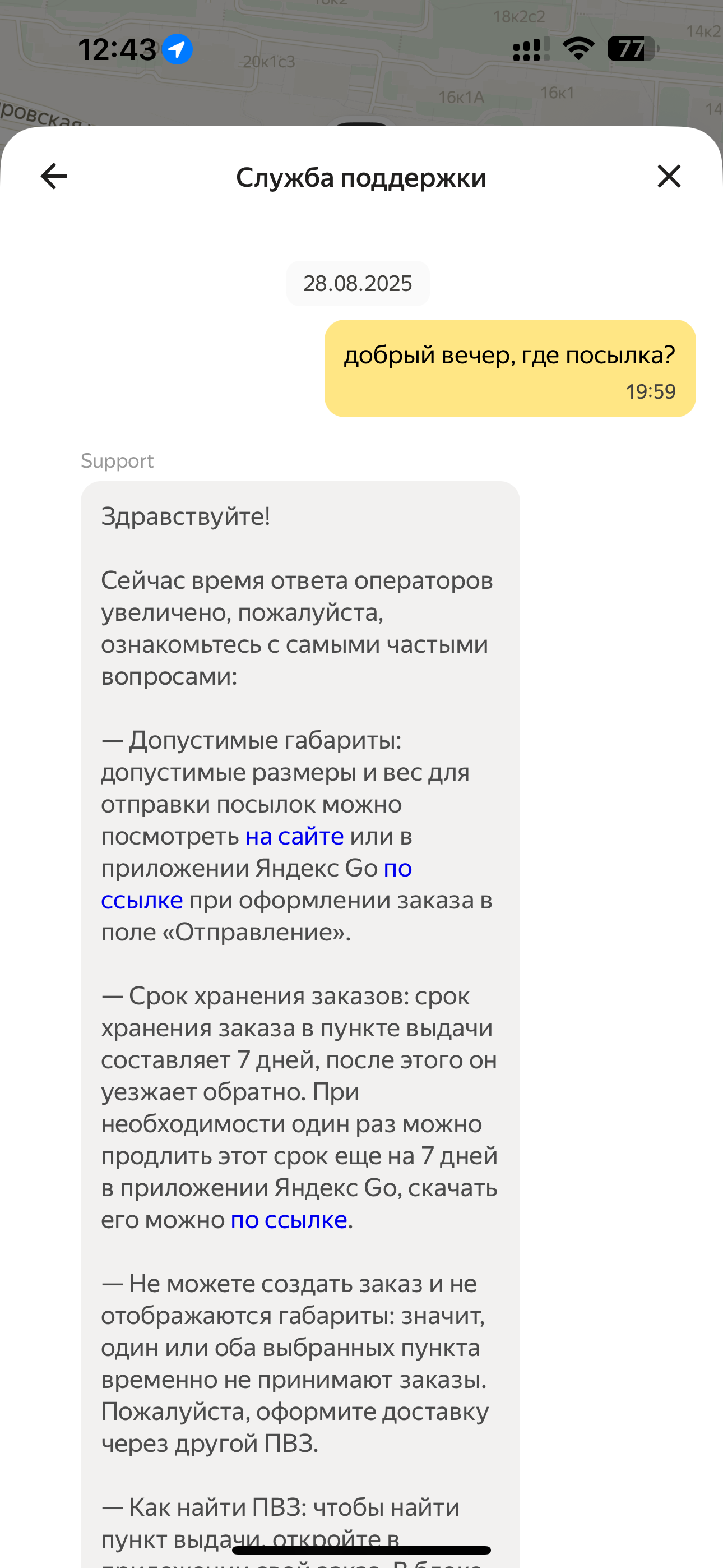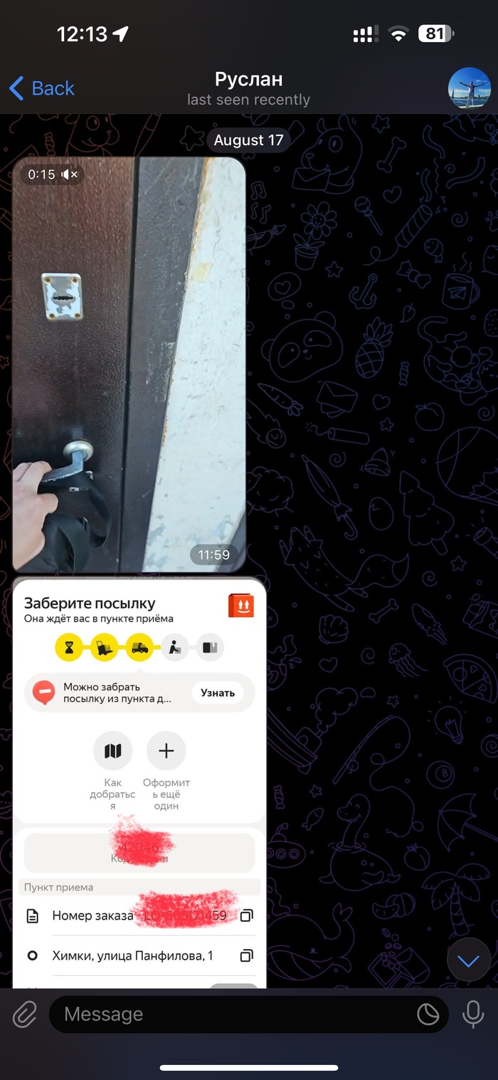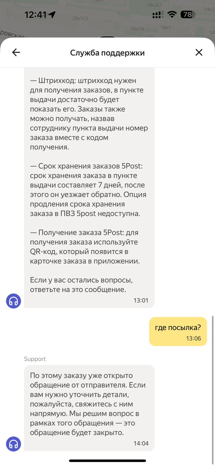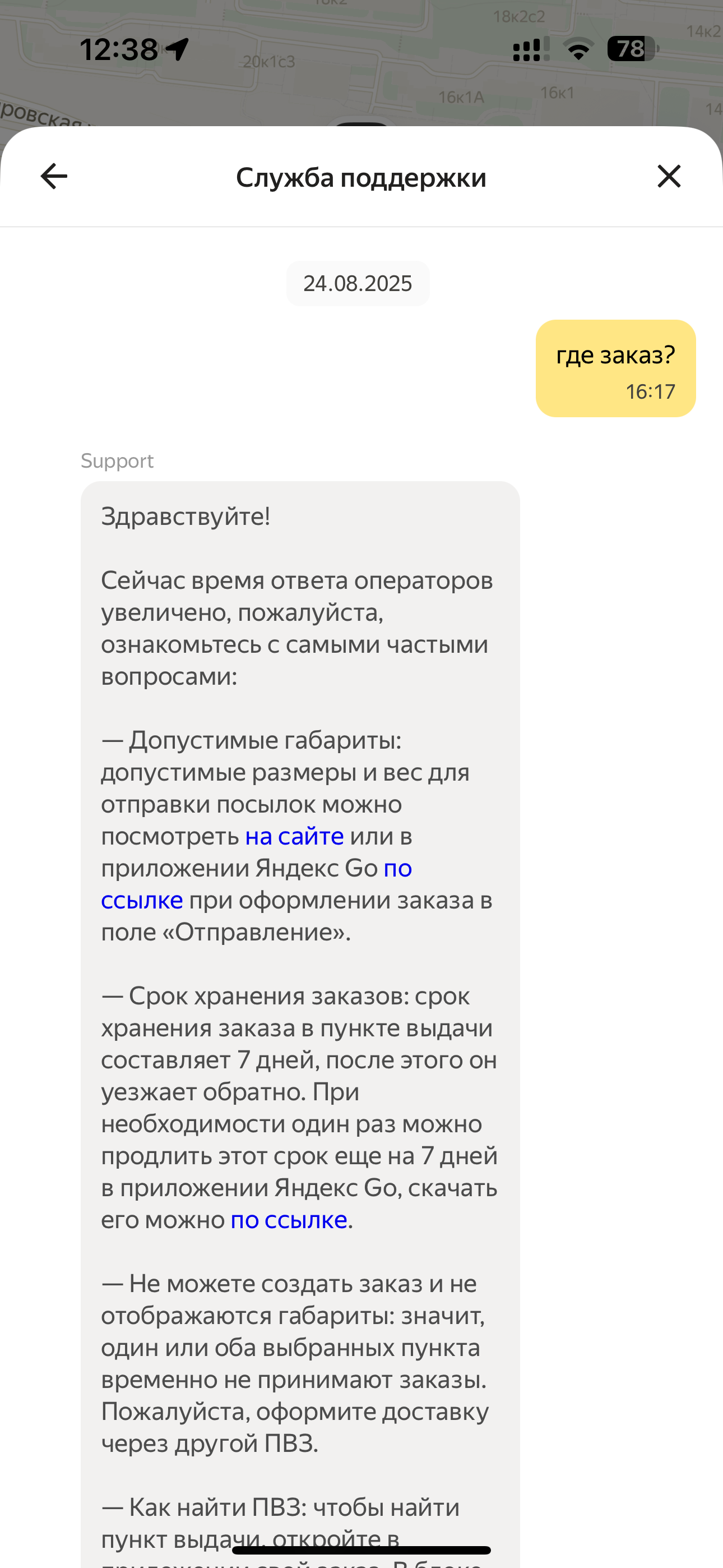 16 августа согласно приложению Яндекс Go - посылка вернулась в ПВЗ, откуда ее отправляли и я попросил Руслана вернуться (хотя у человека есть чем заняться, кроме как ходить в ПВЗ). Согласно Яндекс Картам - ПВЗ открыто и работает без выходных. По факту придя в ПВЗ 16 и 17 августа, оно было закрыто! И Руслан был очень зол, а я не знал что делать, кроме как жаловаться в поддержку, которая отвечает через раз.