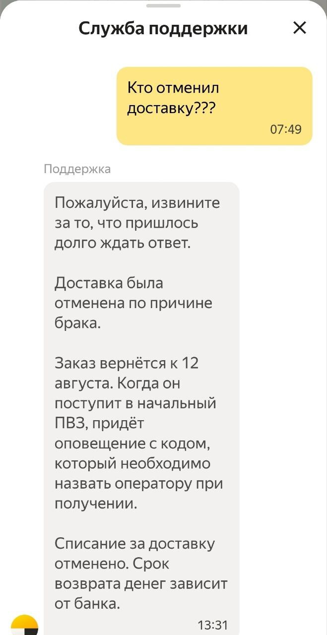 С этого момента началась нервотрепка которая закончилась 2 сентября. Вместо честного ответа - «мы повредили посылку и отменяем доставку» мы постоянно слышали «доставка была отменена по причине брака». Что за брак, какой брак никто толком объяснить не может. Получается Яндекс доставка бракованная! Только благодаря тому что я написывал Яндексу в ВК, то какие-то крупицы информации удалось получить. Тех поддержка в приложении Яндекс GO отвратительно отвечает, ответ может просто не прийти: 3 из 11 обращений остались без ответа