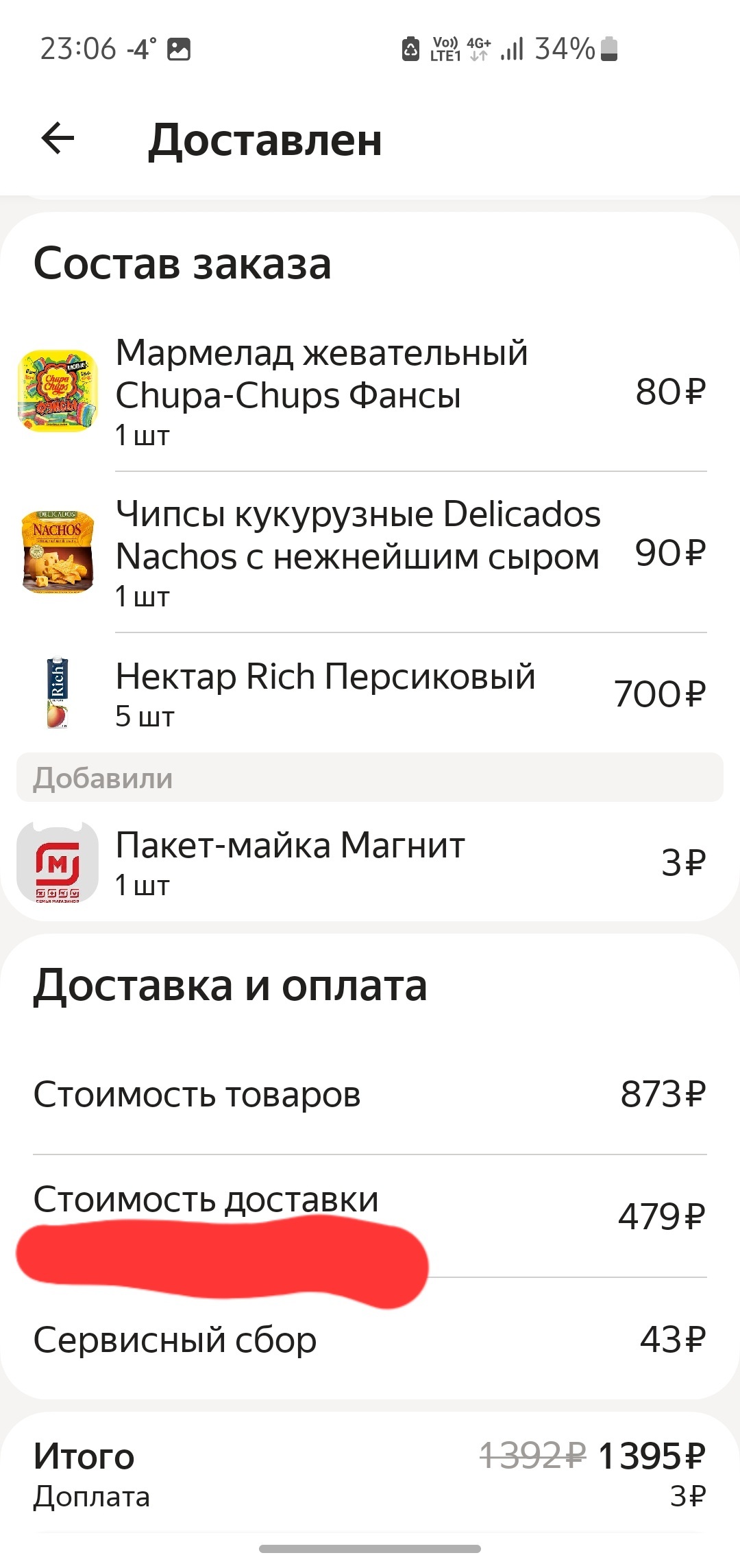 А тут смотрю, о, старая цена, и нет порога минимальной цены, и доставка 220, всё ещё не мало, но да ладно, хочется своего любимого напитка испить. Плюсом добавил чипсы с конфетами и довольный жду. Приходит заказ - чипсы не те, ну да ладно, напишу, что перепутали, вроде должны возместить или скидку дать, захожу в истории заказов и офигеваю, что цена заказа резко выше чем, я помню. Вместо 1100 с чем-то рублей, вышло без 5 рублей 1400. Как это так?