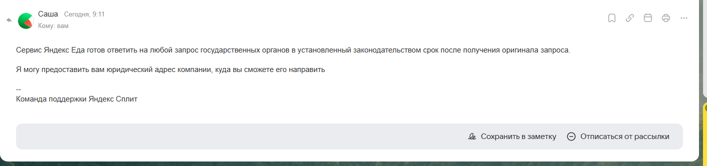 Соответственно ресторан ошибся, сказал Яндекс Еде сделать возврат клиенту, а Яндекс Еда возврат не делает умышленно. Только вопрос в том, что заказ был оформлен в Яндекс Сплит, и я за заказ по сути не оплачивал еще. И сообщил об этом в Яндекс Сплит, что заказ привезли неверный и оплачивать не буду, делайте возврат. На что получил только это: