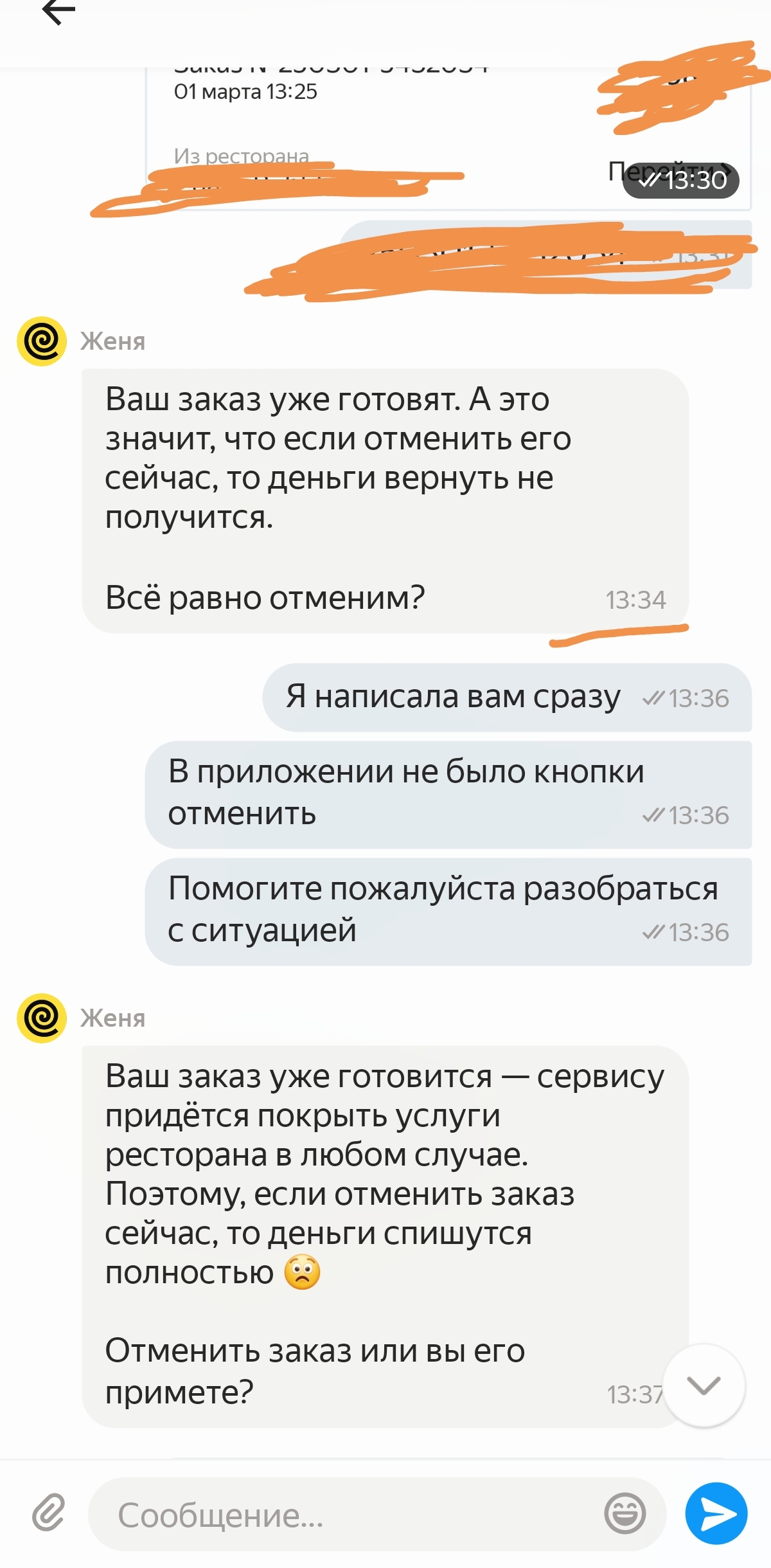 Ситуация, у меня задвоился заказ в приложении в 13:25. Я попыталась найти кнопку "отменить заказ" но её не было. Обратилась (прошу заметить сразу в 13:26) в поддержку яндекс еды через приложение, сотрудник поддержки долго отвечал и вместо того, чтобы сразу связаться с рестораном решил потянуть время. В ответ получила, что мой заказ уже готовят (конечно, нужно же было сразу с ними связаться, а не спустя столько времени). В чате тех поддержке отказались помогать, позвонила на горячую линию там меня послали. Яндекс, ну чтож, сегодня вы потеряли ещё одного клиента