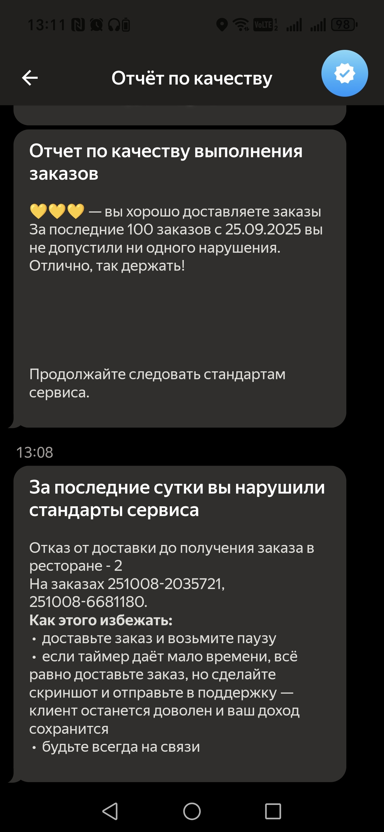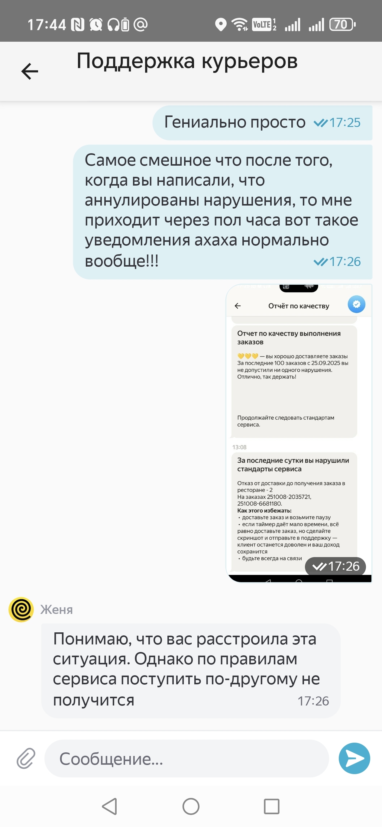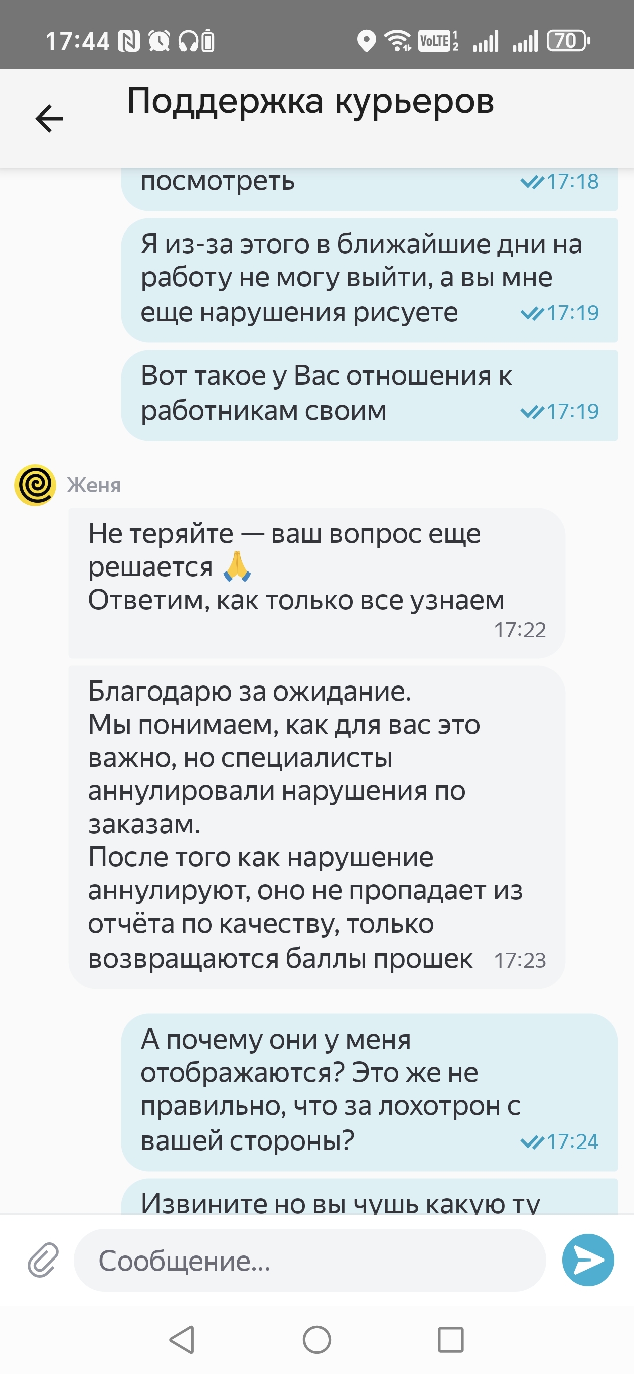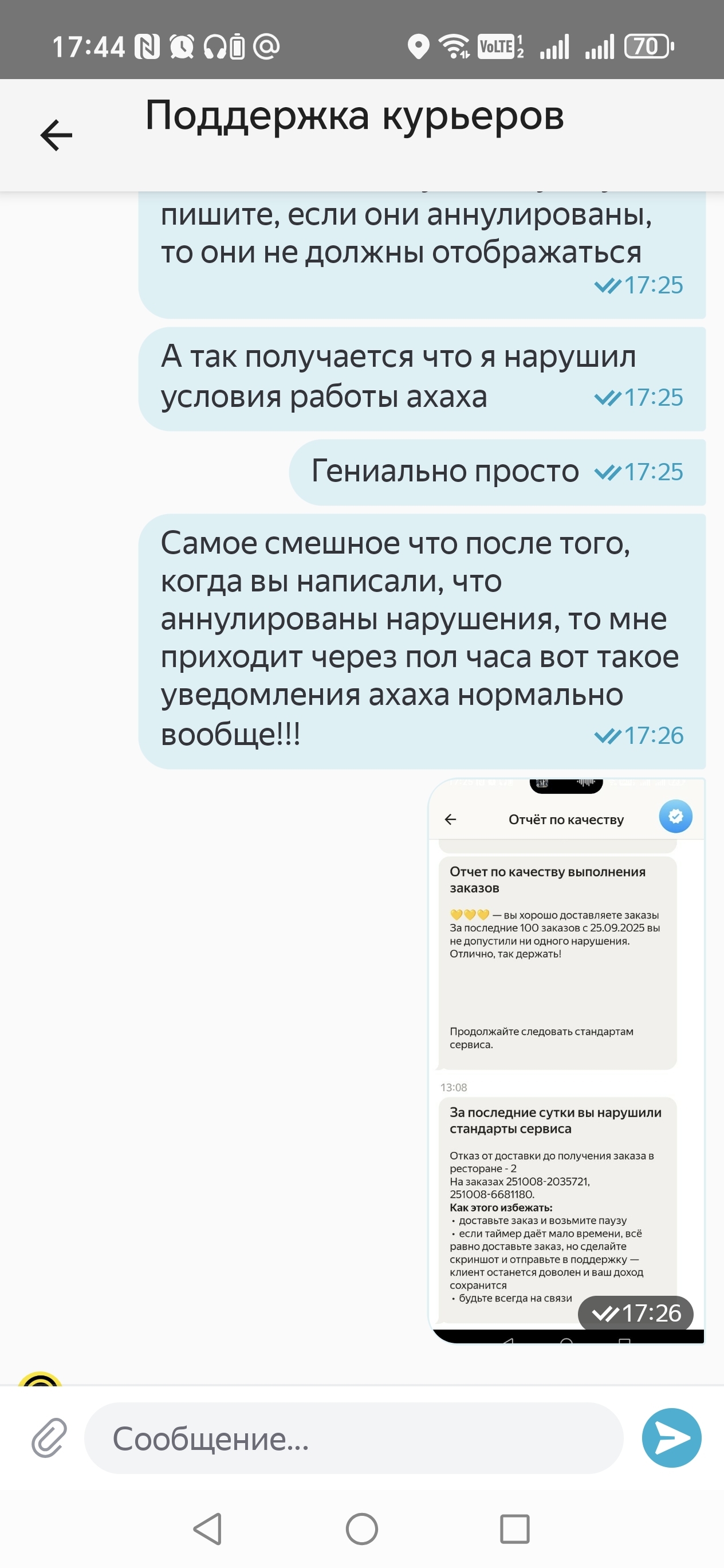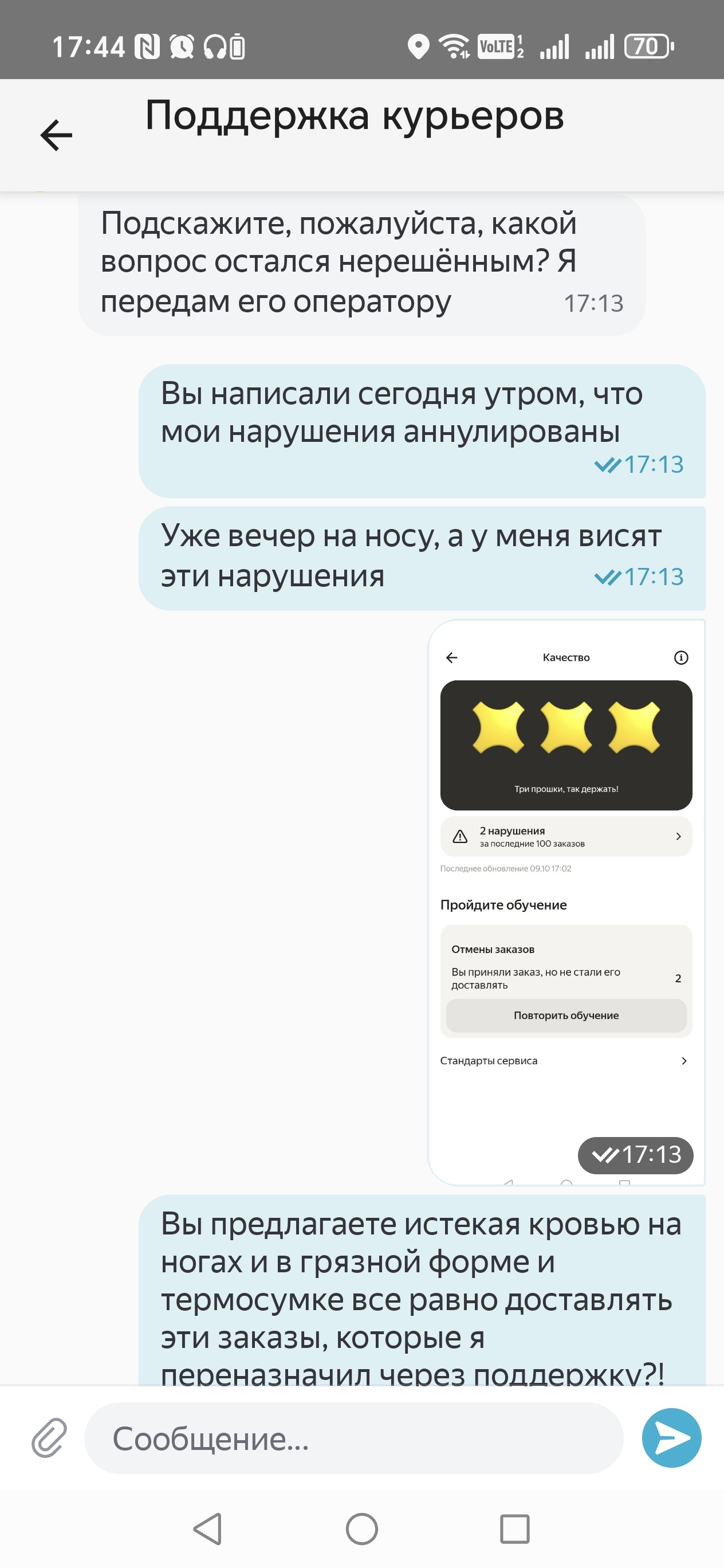 Здравствуйте, во время того, когда я ехал в ресторан я упал с Яндекс байка и получил ушибы, я написал поддержке (скриншоты снизу) . И по правилам Яндекса, как было раньше тем более, когда мне приходили нарушения, они аннулироваются и не отображаются в графе прошек(скриншот снизу) , как вы видите судя по скриншотам они не аннулировались, а до сих пор висит нарушения, которые могут в будущем сказаться на условии работы в яндексе. По мнению Яндекса, если ты упал с байка и истекаешь кровью и плюс грязная одежда и термосумка, то ты все равно должен доставлять заказы. Не идите в эту шарашкину контору работать!