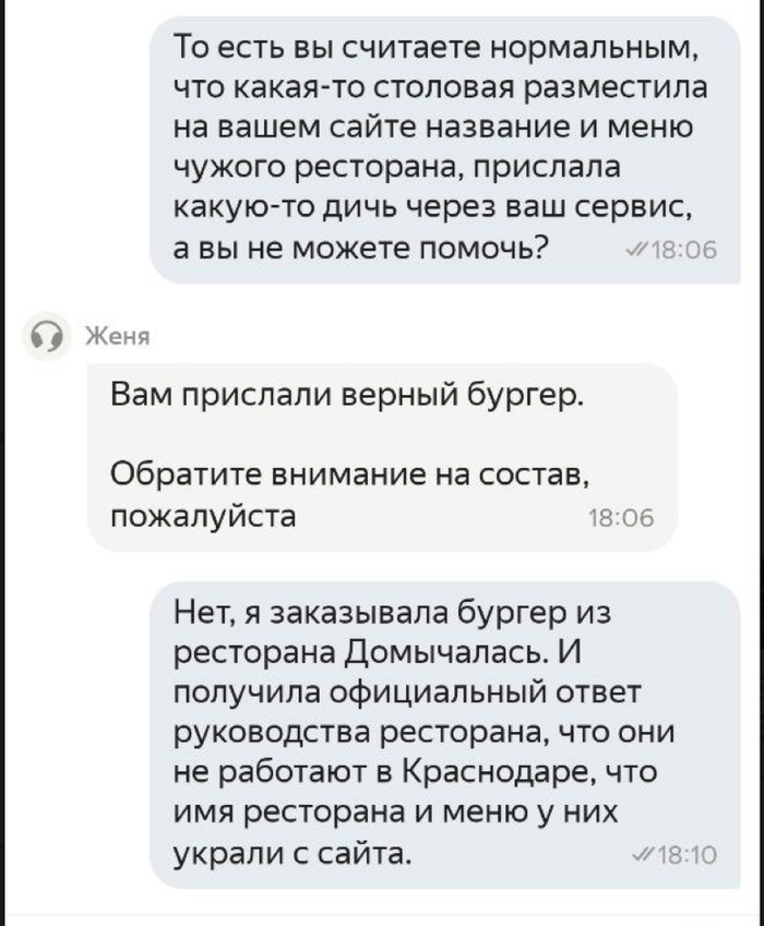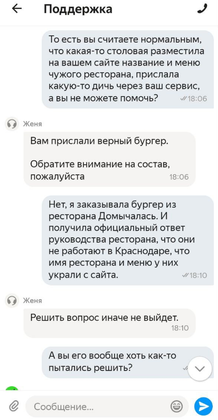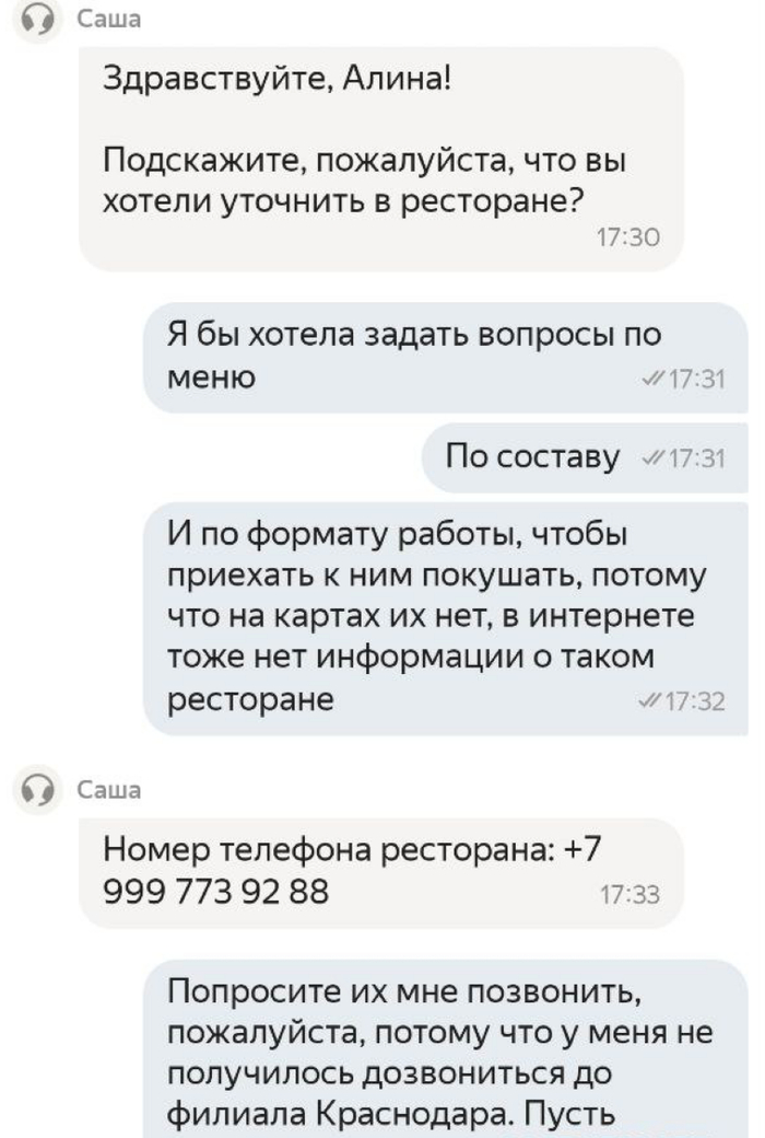 Со мной связывается директор ресторана из Москвы, я параллельно пишу в поддержку, прошу дать мне номер ресторана для связи - присылают номер Московского рестика, где мне уже сказали, что такого ресторана нет в моём городе.