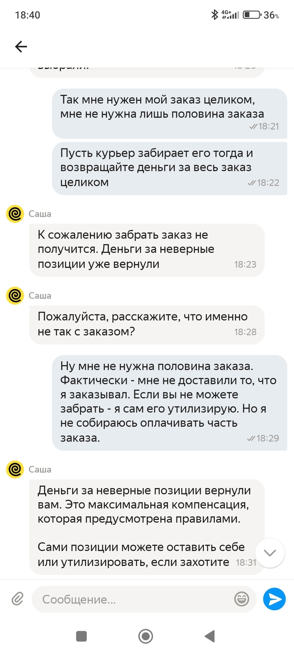 Пишу в поддержку, что не согласен с таким решением и половина заказа отдельно мне не нужна - пусть забирают весь заказ и возвращают все деньги. Дальше просто отписки про то, что забрать заказ они не могут и их правилами не предусмотрена бОльшая "компенсация" (данное слово мне тоже не совсем понятно в данном контексте - мне вроде и не нужна компенсация, мне нужен возврат средств за невыполненный заказ).