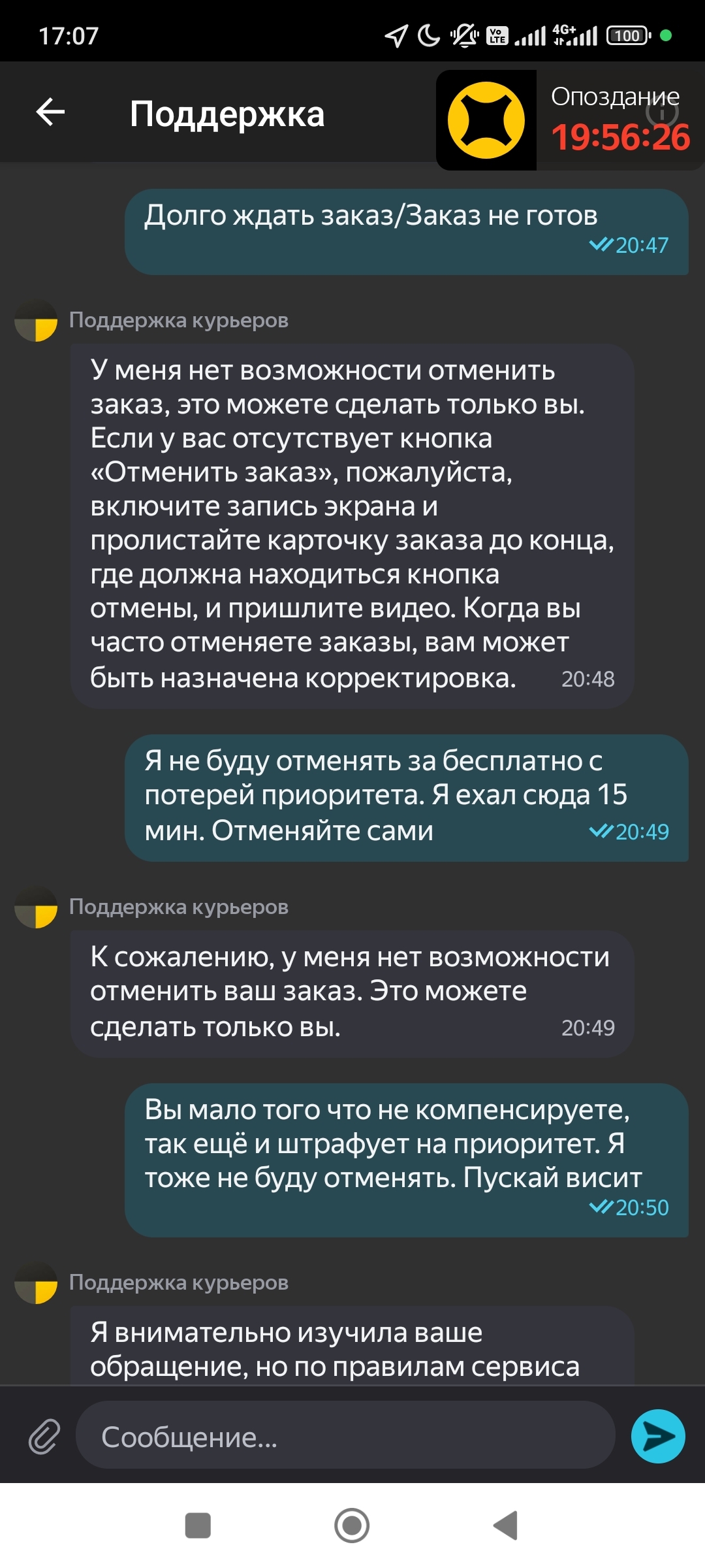 Пришел заказ из Фарша, ехал за ним около 15 мин в ТЦ Колумбус, встал на платную парковку и прибыл в заведение - все как положено. В Фарше сказали, что мой заказ уже отдали др курьеру, дополнив, что сначала был какой-то сбой, долго не искался заказ, а потом приехало несколько курьеров. Обычно это означает, что Я отменяю сам заказ через приложение и теряю баллы приоритета (такие особые очки, которые за выполненный заказ дают +1, за отказ от предложенного, ещё не принятого заказа -3, а за отмену принятого -7). Раньше можно было позвонить в поддержку и она отменяла заказ самостоятельно с компенсацией стоимости заказа. Сейчас в поддержку можно только написать, где бот пишет шаблонные сообщения до момента пока не дойдет до скрипта, где уже не может помочь самостоятельно. Тут вступает в дело человек и продолжает отвечать теми же шаблонами, но с фантазией - шаблоны видоизменяются. Так или иначе через письменную поддержку в таком случае невозможно добиться компенсации потраченного времени и бензина - только отменять самолично.