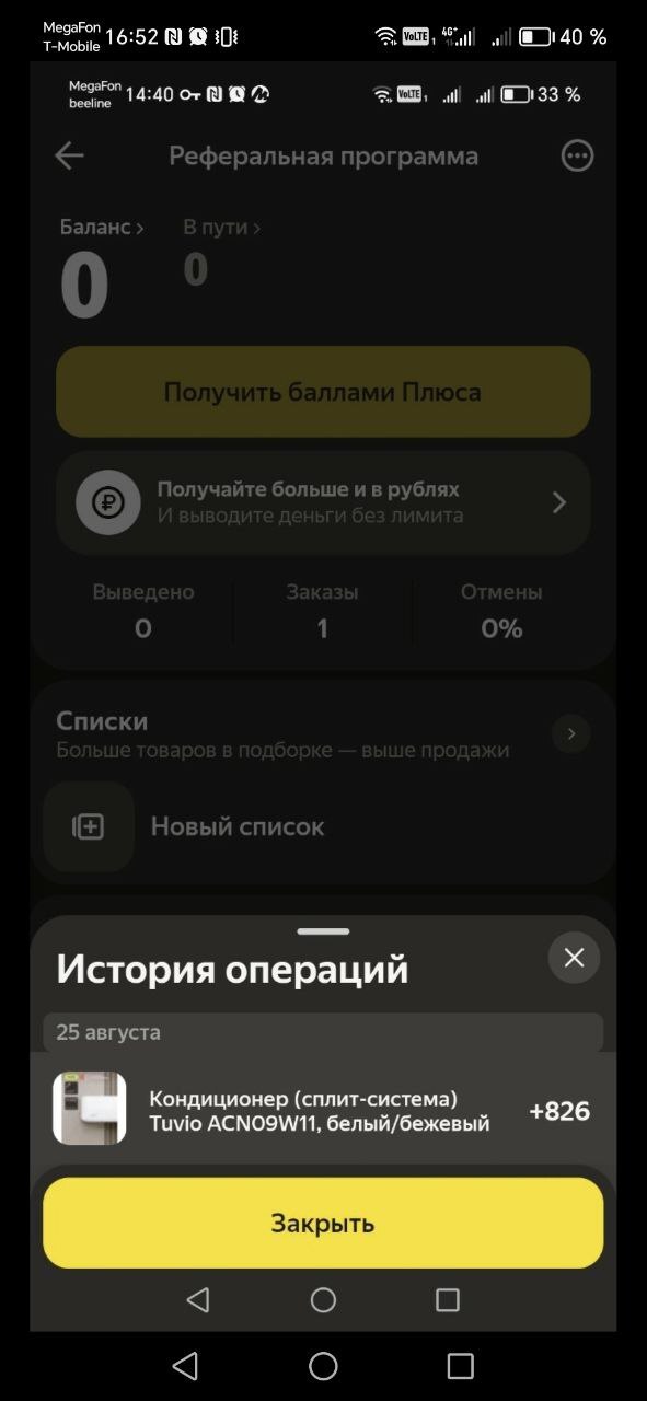 Решил попробовать — порекомендовал другу сплит-систему. Характеристики и цена ему зашли, оформили покупку по моей ссылке и стали ждать. Доставка пришла быстро, а баллы, как положено, должны начислиться через 14 дней после получения (конвертация 1:1).