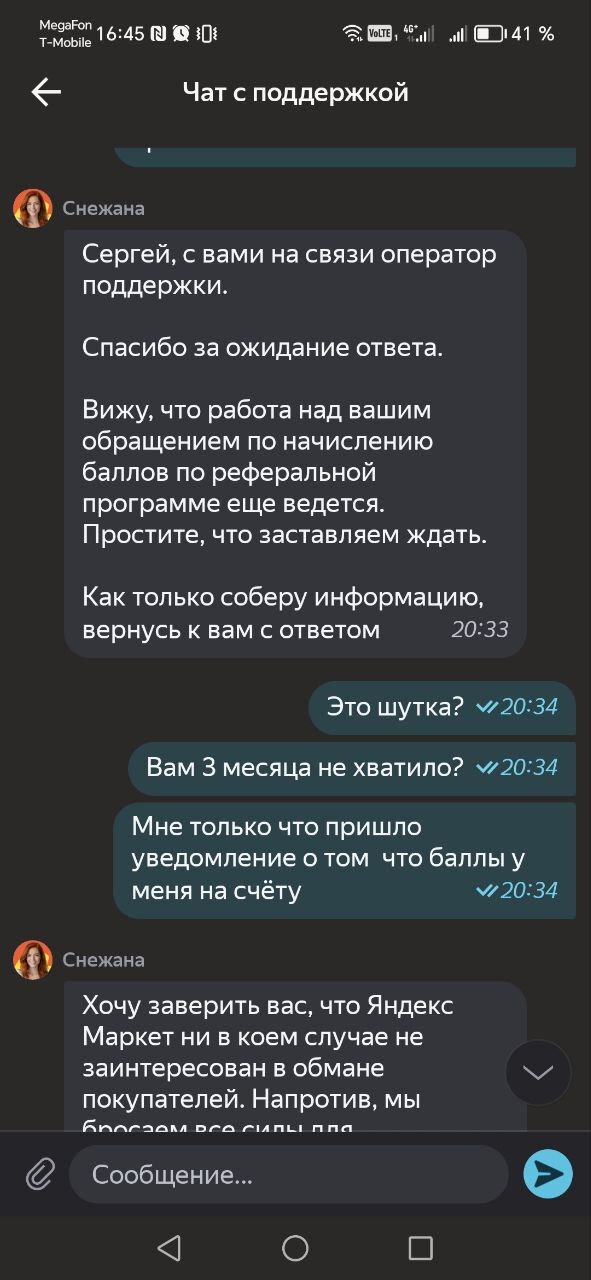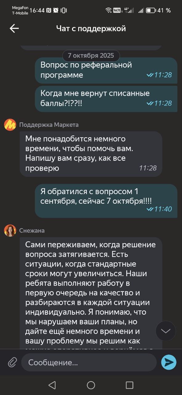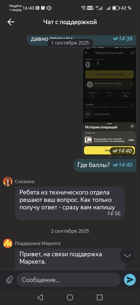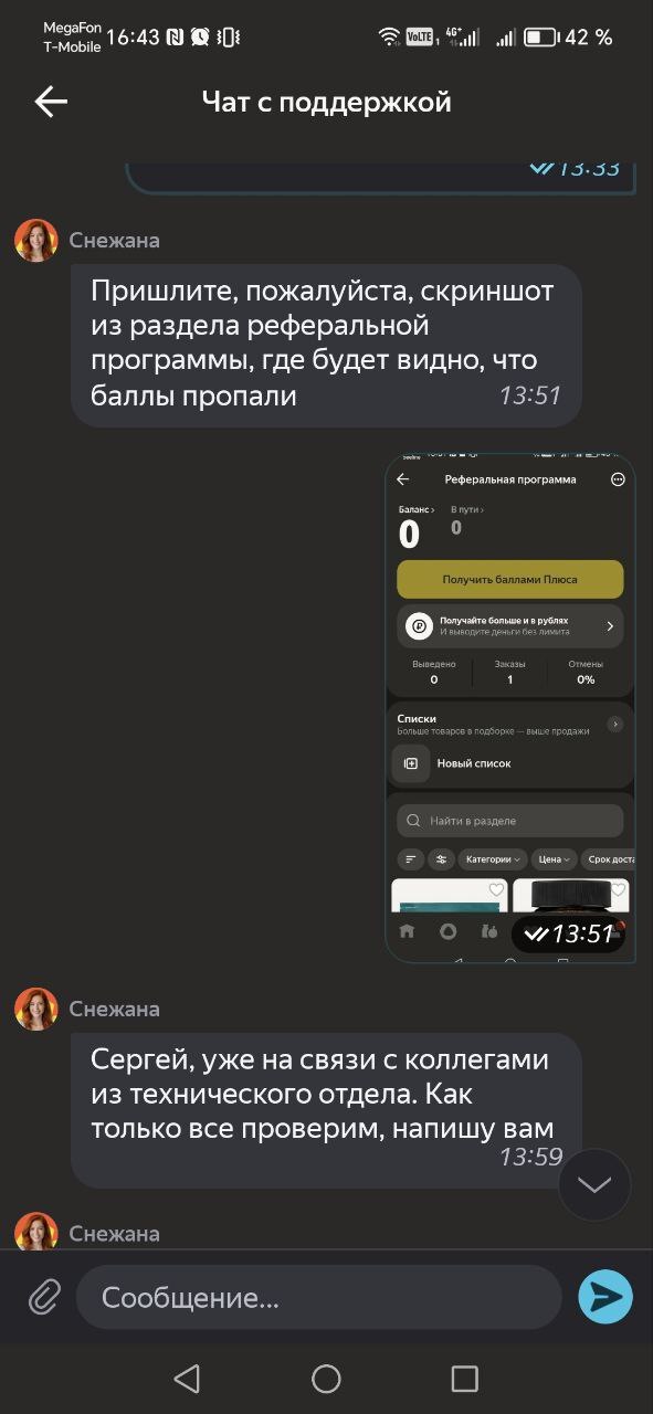 Про обращение уже забыл. Вспомнил про обещанные баллы за рекомендацию через какое-то время, поэтому заглянул в приложение и чат. Ничего не изменилось, поэтому написал ещё раз.