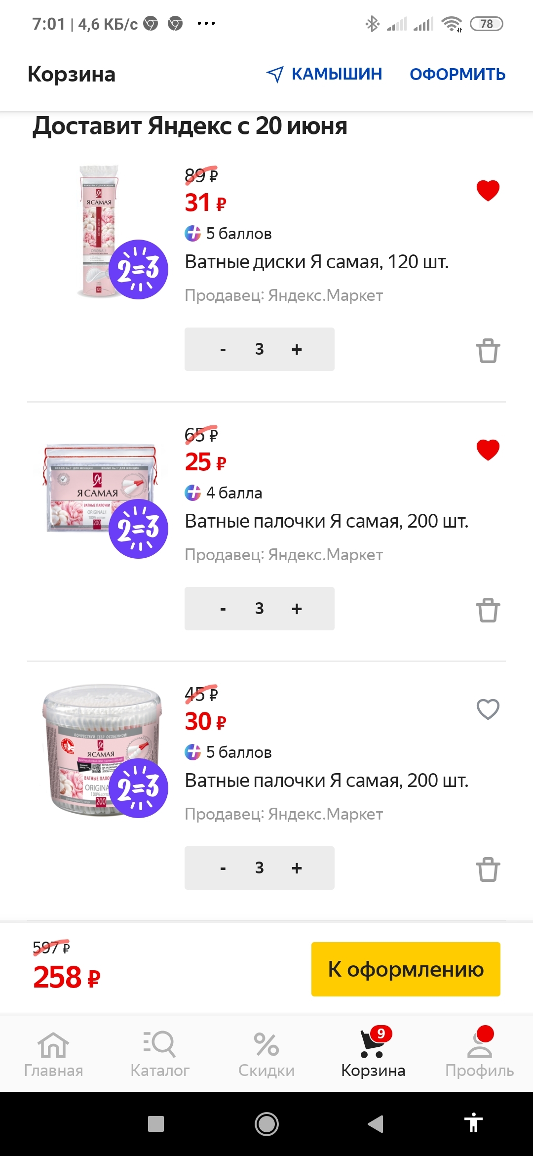 Ну и последний товар доводим до 3-ех единиц (его стоимость варьировалась от 31 до 33 рублей) - вот наконец то получаем какую-то "скидку", общая стоимость корзины снижается на 6 рублей.