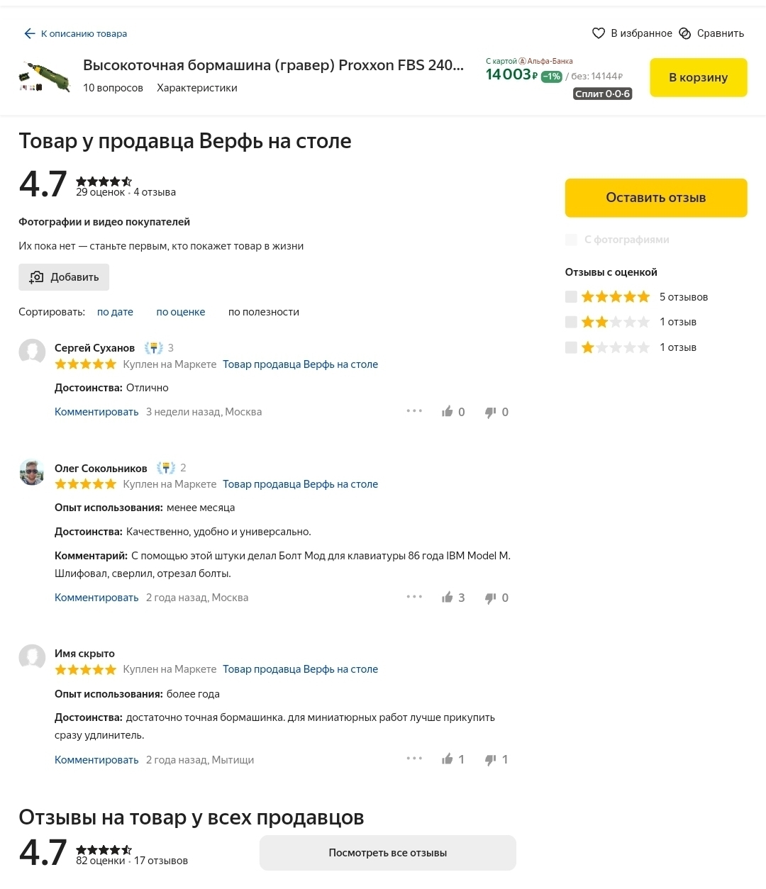 Вопрос на засыпку, граждане, может кто сталкивался. Купила гравер на яндекс маркете, выбрала не китайское г какое-нибудь, а proxxon, германия, отзывы в основном хорошие. Ну и правда машинка приятная в работе, но суть не в этом. Сгорела она через два дня буквально, причем без нагрузки, я шлифовала на минимальных оборотах. Покупаю на маркете давно, и ни капельки не беспокоясь, создала заявку на возврат. Как же блин я удивилась, когда от продавца мне прилетела целая истерика, мол, товар не его, я подменила, ему старый подсунуть пытаюсь, и вообще по мне 159 плачет. То есть, дайсон за 60 к я не подменила, заплатила и пользуюсь довольная, техники в общей сложности за последние полгода тысяч на 300 куплено и все ок, а на гравере за 12922 я решила развлечься. Я вообще-то надеялась, что яша все порешает и продавцу пропишет дулю, но я не угадала. Сегодня пришел отказ, мол этот товар продавцу не принадлежит. Самое интересное, что у меня ведь нет видео распаковки, серийных номеров на машинке нет, да и весь комплект вместе с документами я отдала на возврат. Сижу и чешу репу, вот даже если мне будет не лень (я пока не решила, мне больше лень или обидно от такого кидалова) и я пойду в суд, как я буду доказывать, что именно этот гравер покупала? Может правда на старый подменила, возможно ведь и такое. И мои честные глаза и заверения о том, что я узнала, что такое гравер, только месяцев несколько как, судью ясное дело не убедят. Может сталкивался кто? Как дело закончилось?