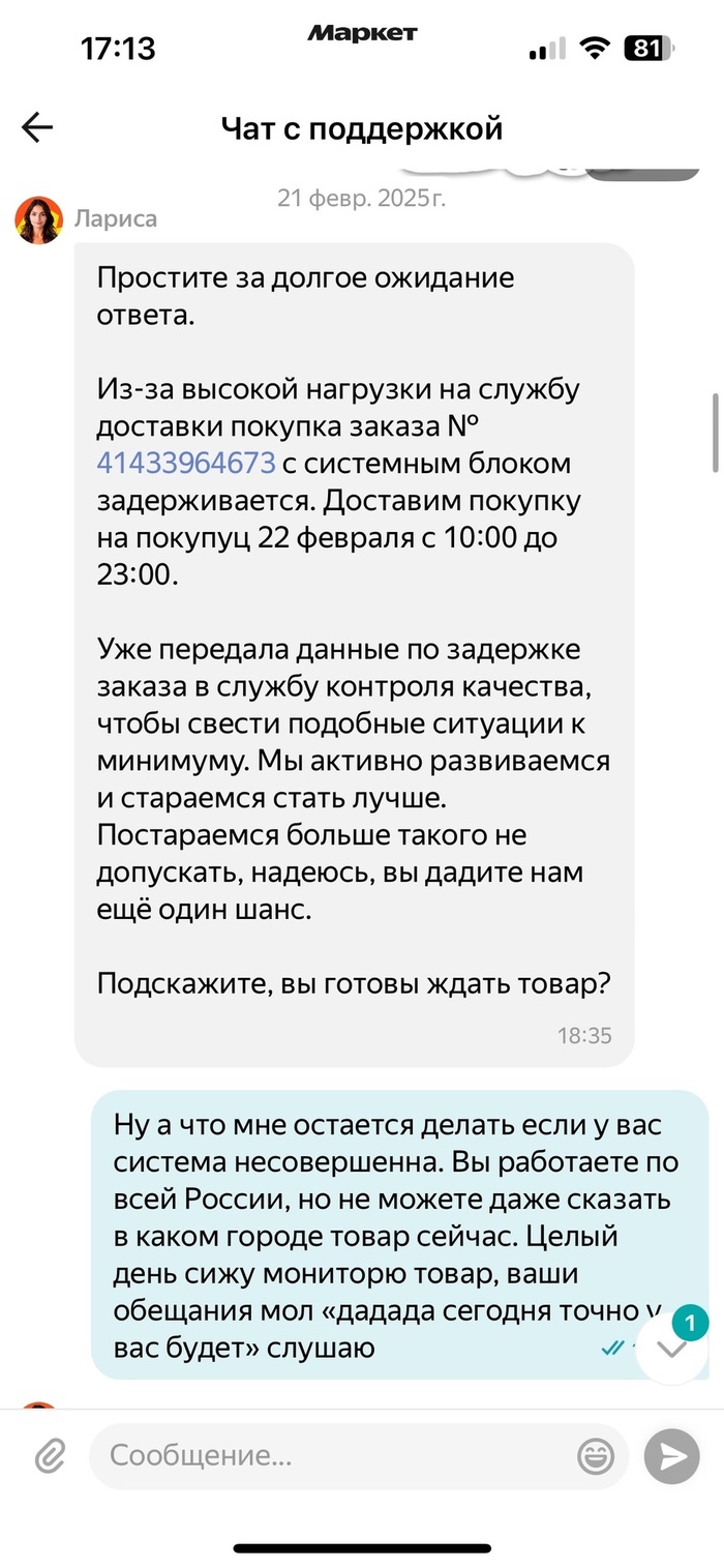 Значит, история такая. 17.02.25 заказал системный блок на Яндекс Маркете в сплит. 18.02 он был принят в обработку продавцом, продавец начал его собирать. Дату доставки обещали на 21.02. Окей, ждал, периодически захотел смотреть статус заказа, который не торопился сменяться на "Передан в доставку". 20.02 зашёл, статус стоит "Собран и готов к отправке". Хмм, смущаюсь, что такими темпами блок придёт вовремя, пишу в поддержку.