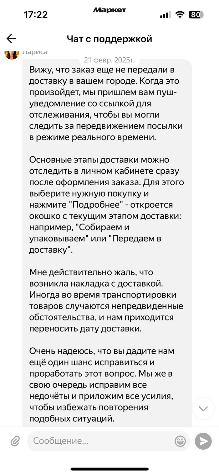 Дожидаюсь вечера, никакого движения в статусе заказа нет, он всё ещё "Передаётся в доставку". Пишу снова, тут агент поддержки мне пишет, что доставка задерживается и заказ теперь приедет 22.02.