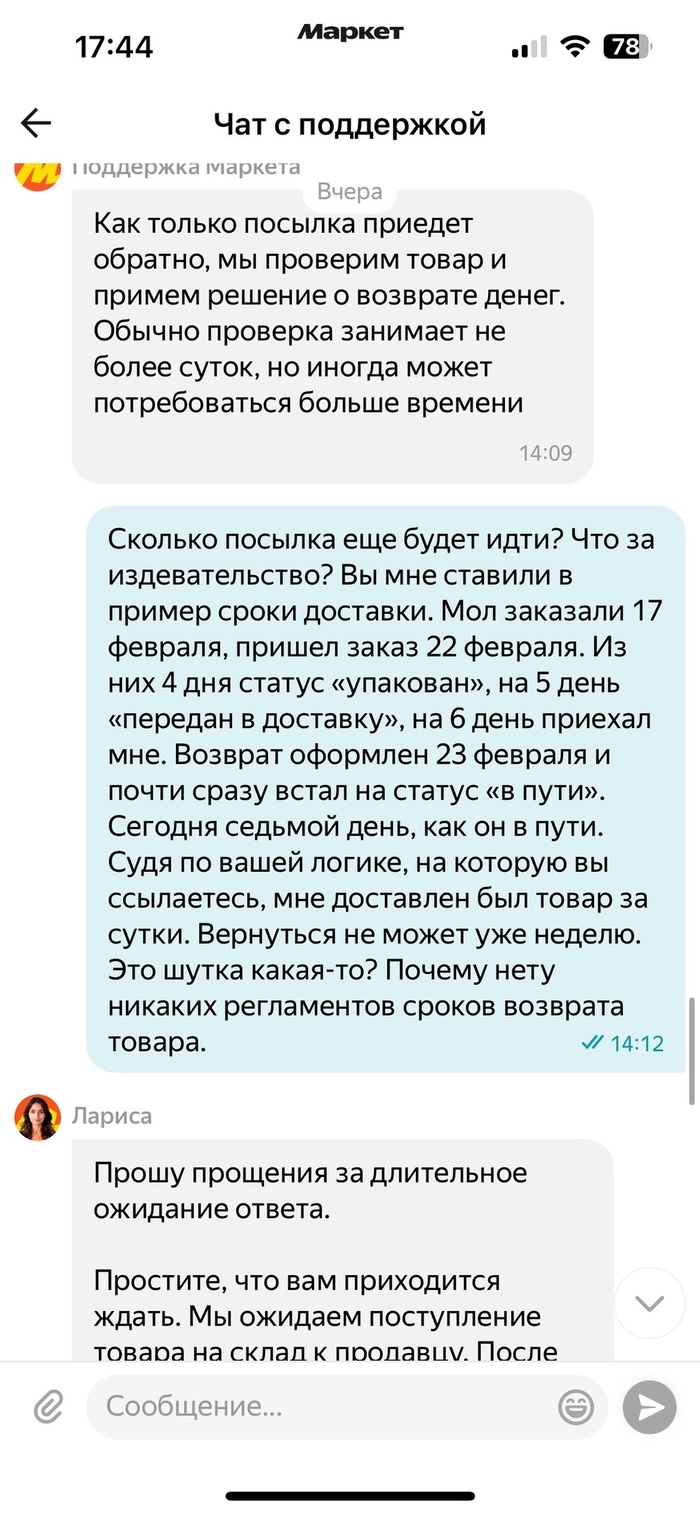 На вопрос о сроках возврата товара по регламенту, ответ такой, что у них нет никакого регламента. Ссылаясь на сроки доставки товара до меня, указали этот срок и расплывчато намекнули, что срок может быть больше, меньше или такой же. Но из вышесказанного, реальный срок доставки был сутки, ну может быть двое. Не получив внятного ответа в поддержке приложения "Яндекс Маркет" и прочитав несколько постов на pikabu, пишу им в группу ВК, где ответы получаю +- такие же. Звоню в поддержку, общаюсь с девушкой, пытаюсь выпытать о примерном местоположении возврата. Та говорит, что максимум её возможностей - это отправить запрос логистам и они ответят мне на почту. Спустя чуть более суток никакого ответа не получил.
