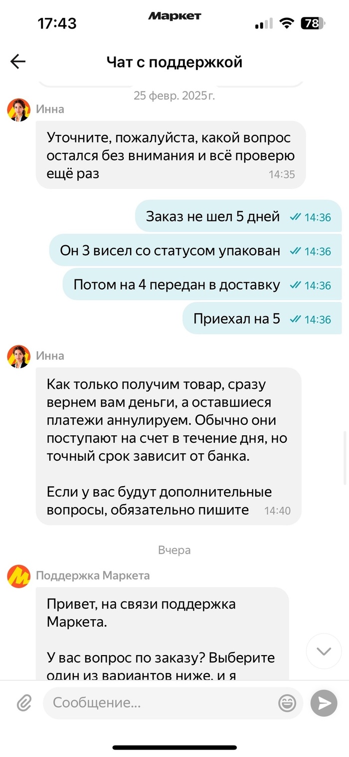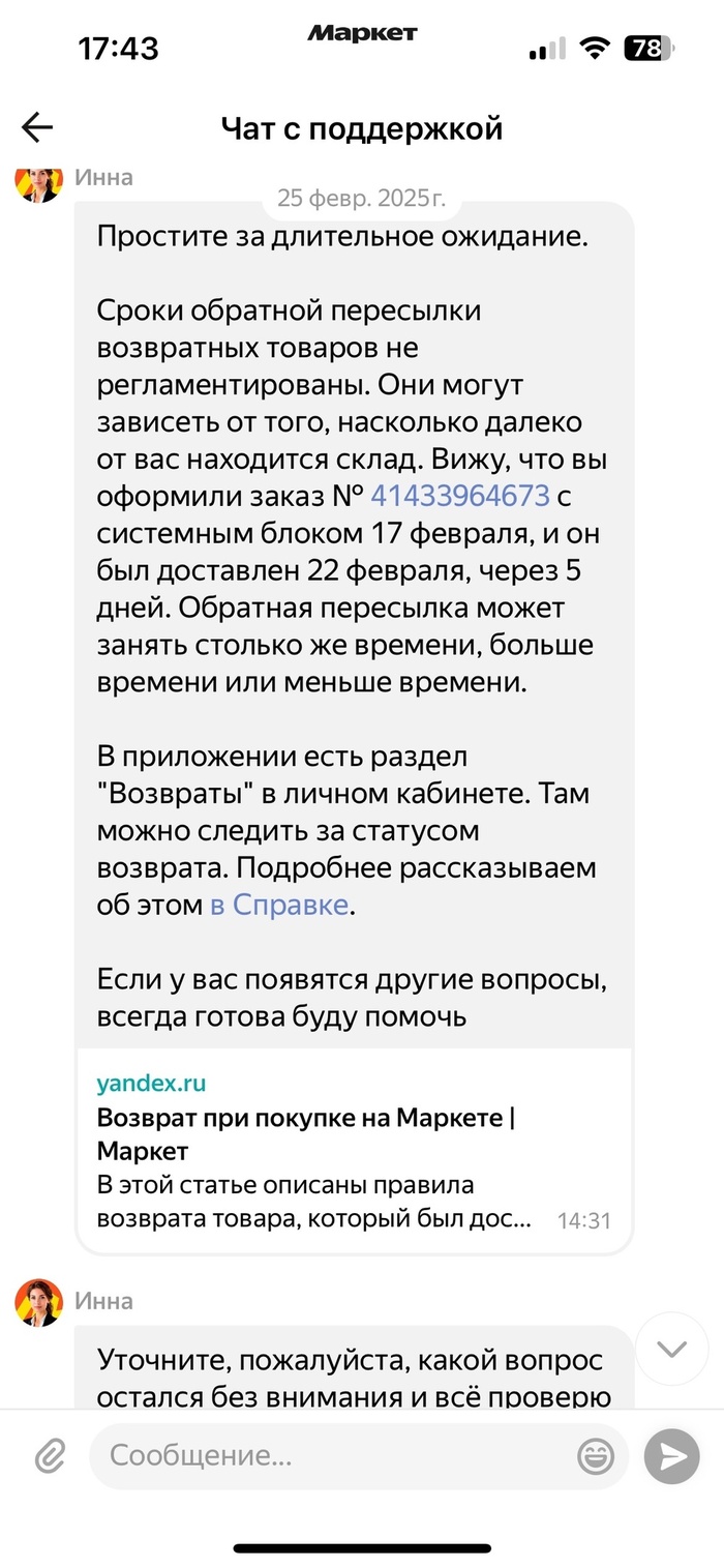 Отдал возврат 23.02.25, "в пути" он до сих пор, то есть неделю. 25.02 пишу в поддержку, спрашиваю когда возврат будет проведён, ответы по типу "не знаем", "ожидайте" и прочее.
