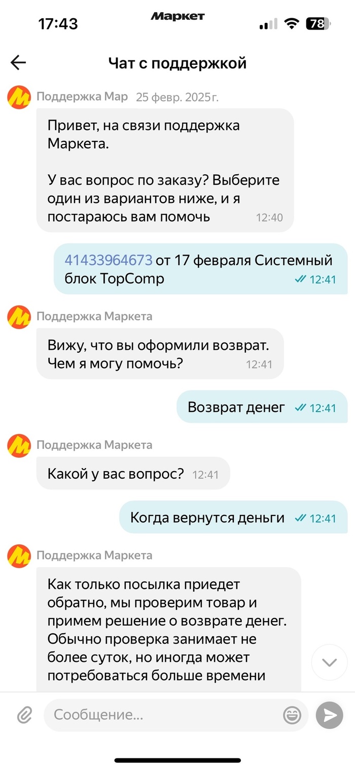 Далее, 22.02.25 в статусе заказа появляется отслеживание курьера с заказом, целый день мониторю и наблюдаю, как курьер крутится вокруг моей улицы, развозит все соседние, проезжает в 100м от моего дома, но не заезжает ко мне, а едет в другой район. Уточняю этот момент в поддержке, т.к. не понимаю логики доставки, на что мне отвечают, что система построения маршрутов автоматическая и всё такое. Ладно, принимаю это, жду курьера, который должен позвонить за 30-60 минут до доставки. Он звонит за 5-10 минут, уточняет дома ли я и доставляет заказ. Приезжает холодный блок, оставляю его на 4-5ч набрать комнатную температуру, затем подсоединяю и включаю его. Приехал, кстати, за 71 тысячу, откровенный хлам, тот самый дешёвый китай, о котором у многих сложился стереотип. Из нормальных производителей только производитель видеокарты - msi, остальное китайские ноунеймы. Окей, включил компьютер, поставил некоторый софт, скачал 2 игры, захожу в 1, не очень требовательную Counter Strike 2, успеваю зайти в настройки, поменять разрешение и вдруг в районе компьютера слышу щелчок, монитор гаснет, все подсветки на системном блоке тоже, пахнет горелым пластиком. Больше компьютер не включился. Оформляю возврат тут же, несу его на ближайший ПВЗ, снял на видео, как я его упаковал, на ПВЗ девушка всё проверила, я ей всё показал, что даже плёнок не снимал, все пломбы от продавца на месте. Девушка попалась приятная, говорит, что сегодня же мой возврат уедет, т.к. курьер ещё не был на ПВЗ. Так оно и произошло, запаковали товар на ПВЗ, дошёл до дома и через 20 минут возврат в статусе "в пути".