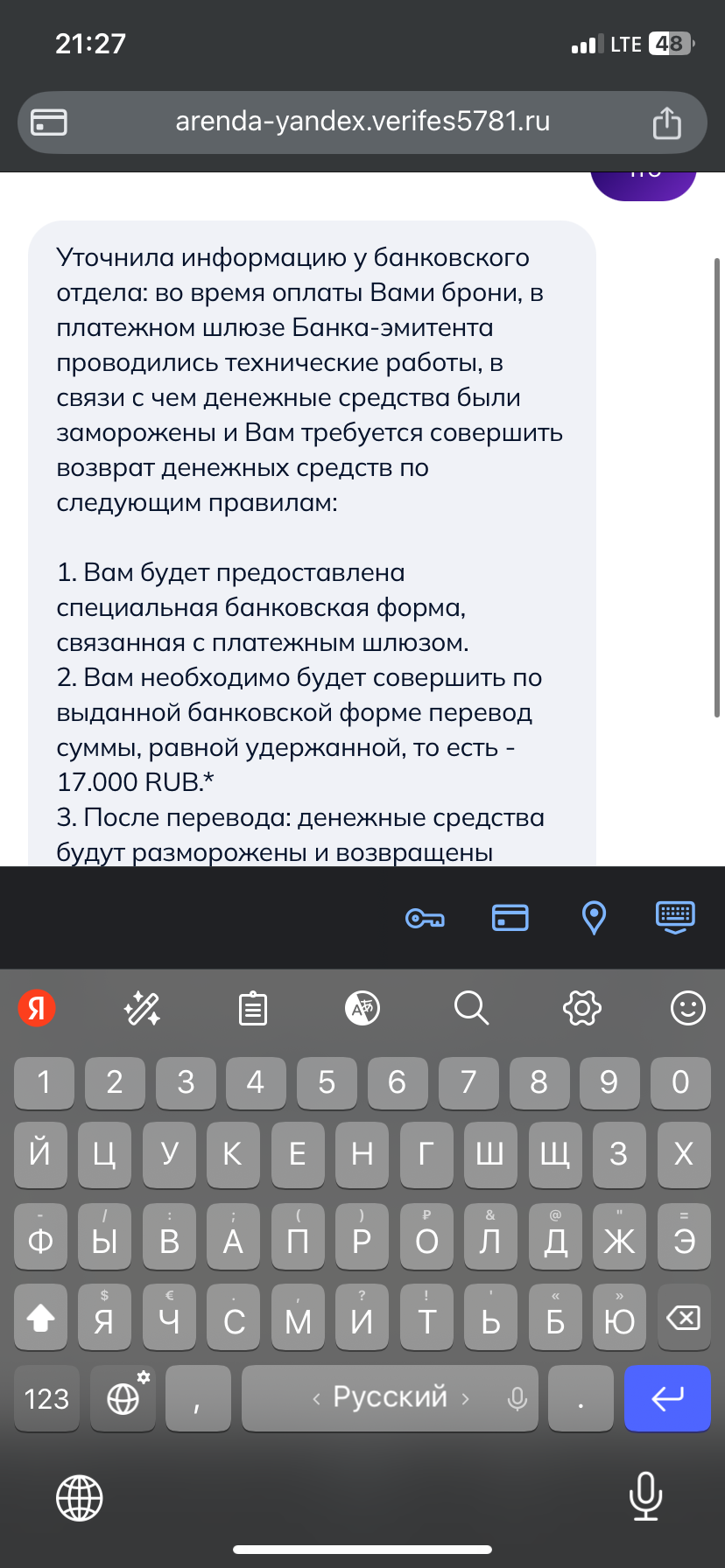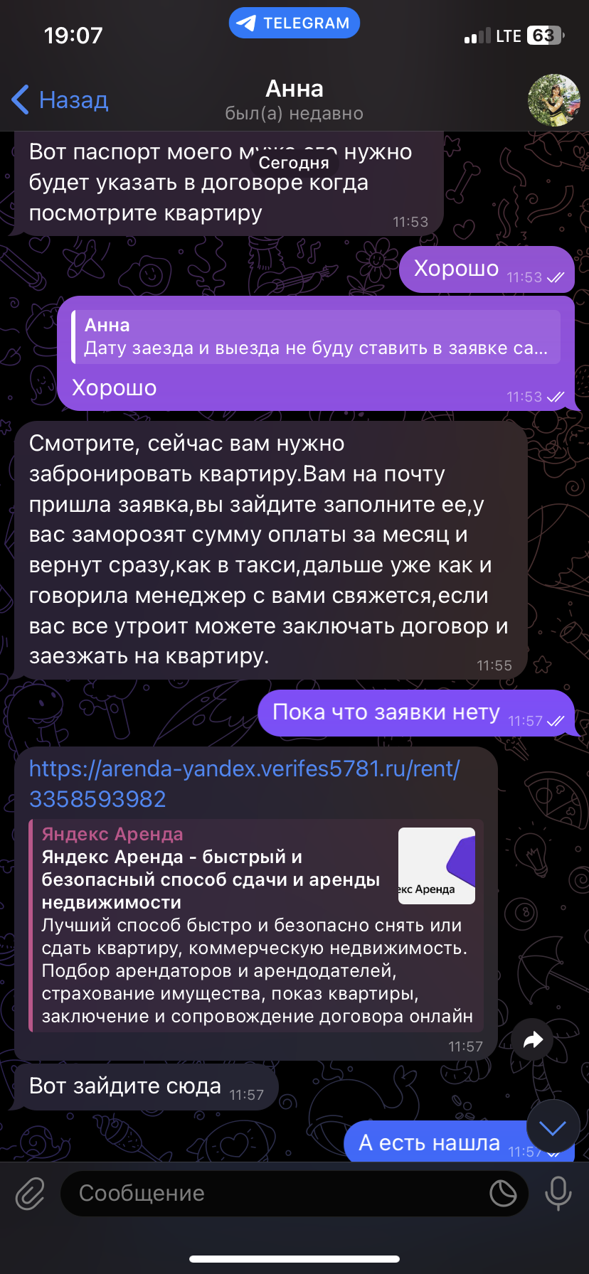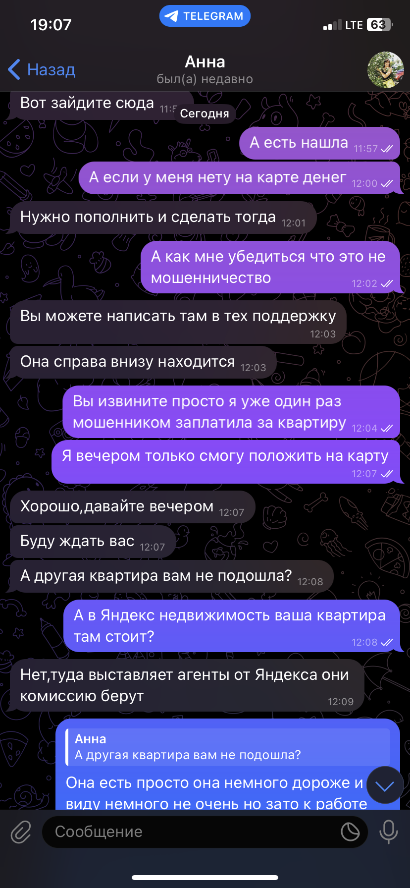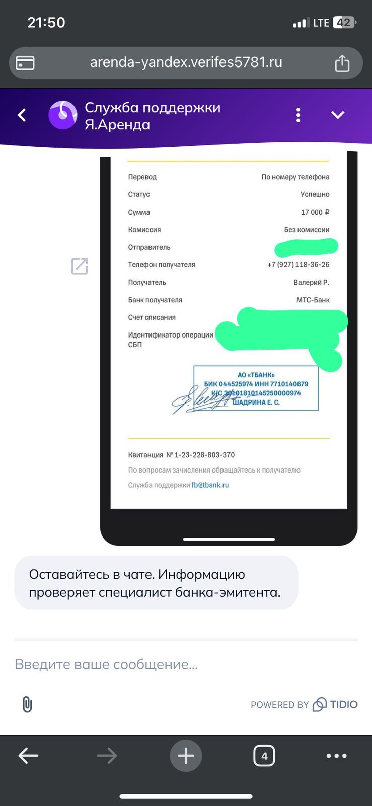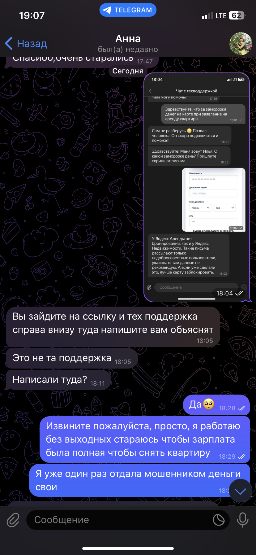 Нарвалась на мошенников. По переписке видно, конечно, что мошенники, но тогда голова не работала вообще Слишком наивный человек. Я очень хотела снять квартиру.Сначала вечером отказалась. написала, что передумала, ибо подозрительно. Но она уверяла, что всем отказала ради меня и что если что, у меня есть ее мужа паспорт, и что поддержка не может же врать. Если бы не сайт этот фальшивый, то я бы, конечно, не перевела. Я просто вообще не знала, что они способны на такие вещи. Я серьёзно думала,что как поддержка может врать. Потом только уже спустя 3 дня увидела, что ее сайт и сайт настоящего Яндекса недвижимости отличается.Именно сайтвообще на тот момент забыла, что нужно такие вещи проверять, хотя в интернете очень много искала. думала, что-нибудь найду, что они мошенники. Но нет, к сожалению, ничего не было. Спустя 3 дня только в Интернете решила написать Яндекс.Недвижимость. мошенники. И там столько повылезало историй. Если бы раньше заметила бы, то спаслась бы. Но, увы, Написала заявление в полицию.написала Тинькофф поддержку, но, к сожалению,денег не вернуть. Ну, это и так было ясно.Много голову ломала, сомневалась,мошенники или нет. Перевела, к сожалению,34 тысячи. Там дальше переписки нету. Это якобы женщина все удалила. Когда мне в поддержки написали, чтобы вернуть 34 тысячи,я должна еще 34 перевести 3 дня.Расстроилась. Но хорошо, пусть будет так.Ничего страшного, переживу. Я еще заработаю. Ничего страшного. Не мне судить,что с ними будет за такое. Просто сейчас хочу,чтобы другие не попадались.