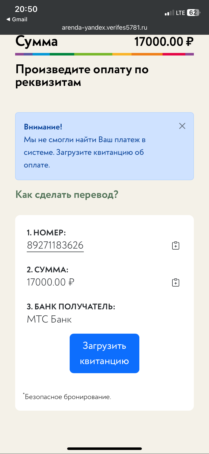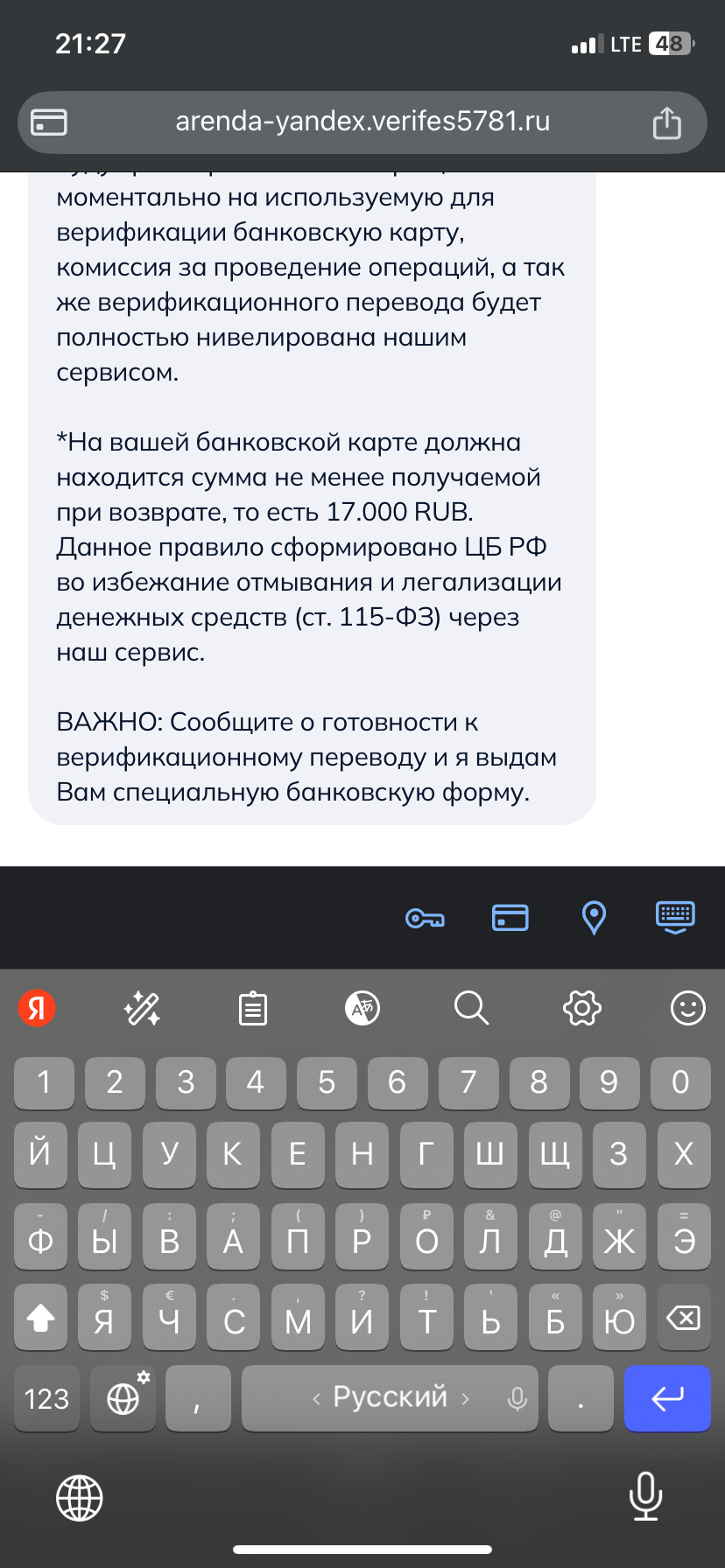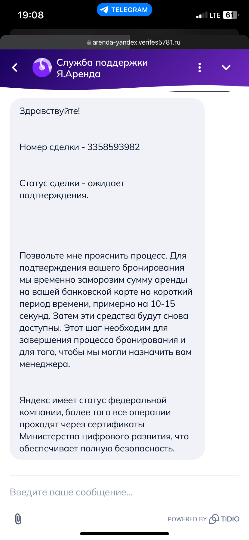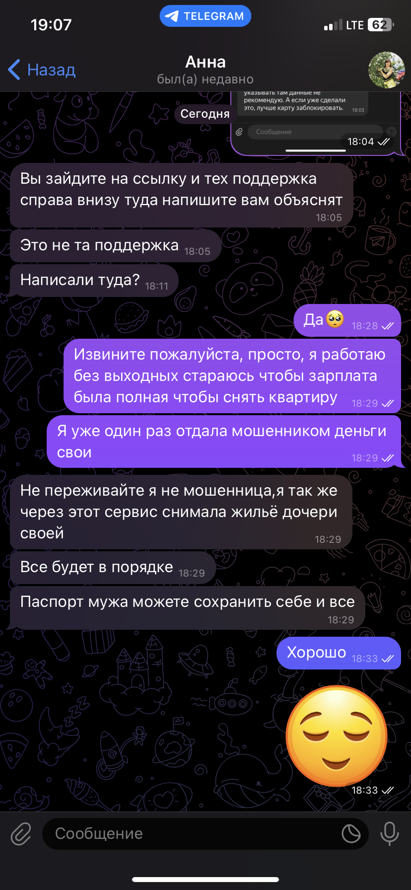 Нарвалась на мошенников. По переписке видно, конечно, что мошенники, но тогда голова не работала вообще Слишком наивный человек. Я очень хотела снять квартиру.Сначала вечером отказалась. написала, что передумала, ибо подозрительно. Но она уверяла, что всем отказала ради меня и что если что, у меня есть ее мужа паспорт, и что поддержка не может же врать. Если бы не сайт этот фальшивый, то я бы, конечно, не перевела. Я просто вообще не знала, что они способны на такие вещи. Я серьёзно думала,что как поддержка может врать. Потом только уже спустя 3 дня увидела, что ее сайт и сайт настоящего Яндекса недвижимости отличается.Именно сайтвообще на тот момент забыла, что нужно такие вещи проверять, хотя в интернете очень много искала. думала, что-нибудь найду, что они мошенники. Но нет, к сожалению, ничего не было. Спустя 3 дня только в Интернете решила написать Яндекс.Недвижимость. мошенники. И там столько повылезало историй. Если бы раньше заметила бы, то спаслась бы. Но, увы, Написала заявление в полицию.написала Тинькофф поддержку, но, к сожалению,денег не вернуть. Ну, это и так было ясно.Много голову ломала, сомневалась,мошенники или нет. Перевела, к сожалению,34 тысячи. Там дальше переписки нету. Это якобы женщина все удалила. Когда мне в поддержки написали, чтобы вернуть 34 тысячи,я должна еще 34 перевести 3 дня.Расстроилась. Но хорошо, пусть будет так.Ничего страшного, переживу. Я еще заработаю. Ничего страшного. Не мне судить,что с ними будет за такое. Просто сейчас хочу,чтобы другие не попадались.