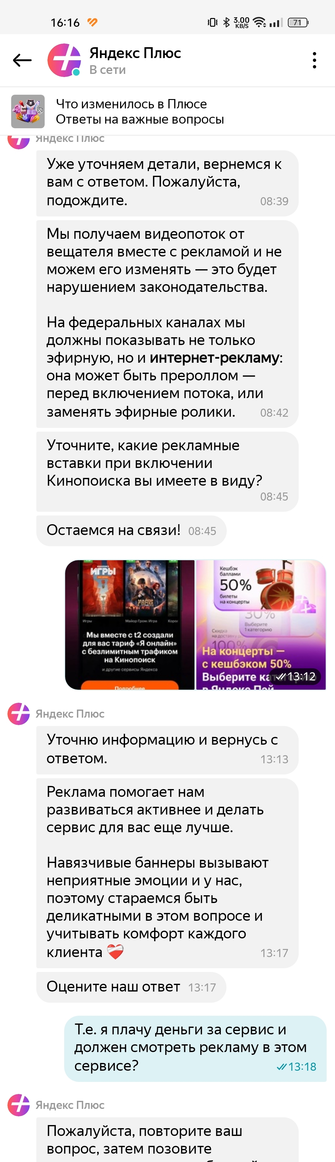 Для начала ввел дополнительную подписку на продвинутую Алису, потом объявил о увеличении цен на ближайшие два года в два раза ( с меня и так содрал лишнюю тысячу.). Если кто не замечал, то в каналах КиноПоиска, в федеральных каналах (по которым и так огромное количество рекламы), при включении показывается дополнительная реклама, уже от самого Яндекса. При включении КиноПоиска или Ямузыки тоже показывается реклама где по нажатию ты залетаешь на деньги. Тез поддержка не отвечает просто неделями. А в ответе на рекламу сказали что она их тоже расстраивает))