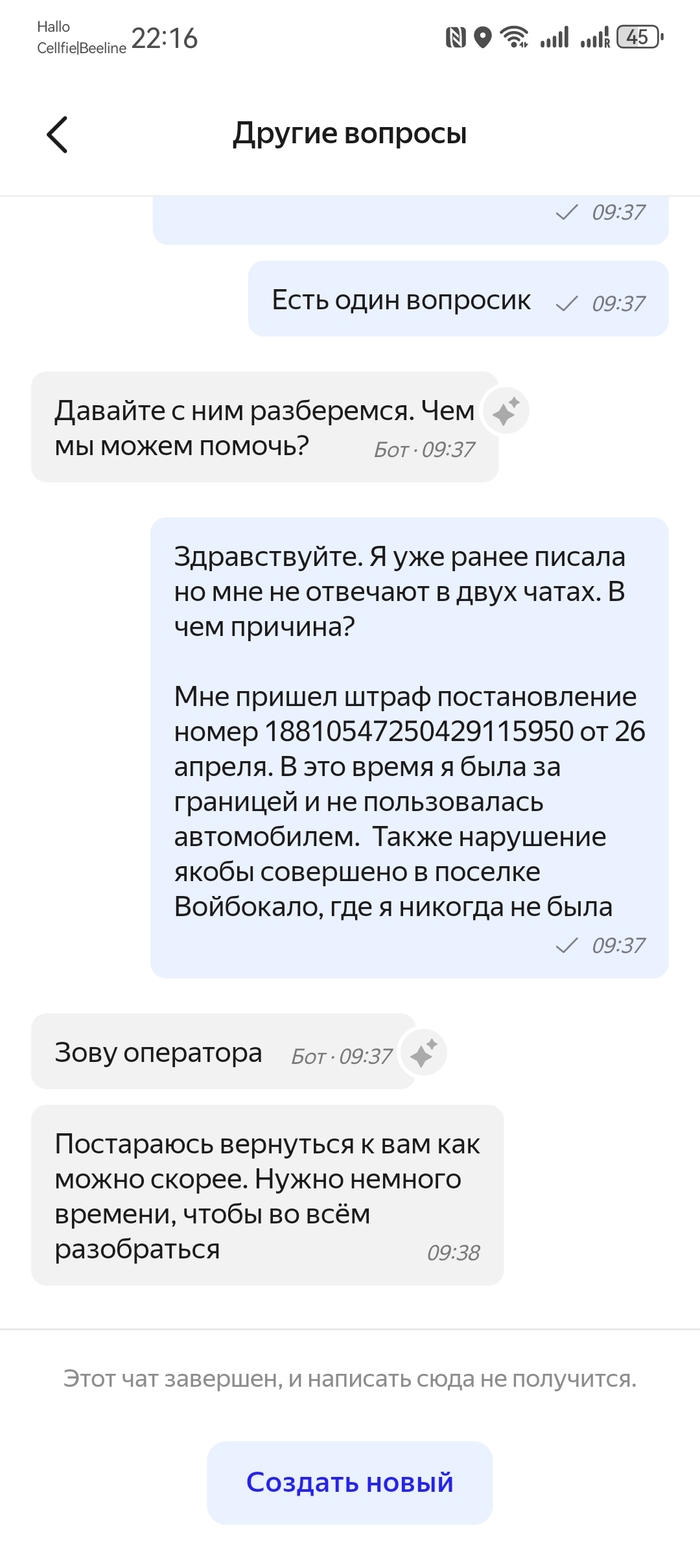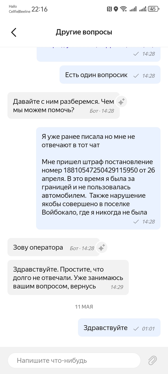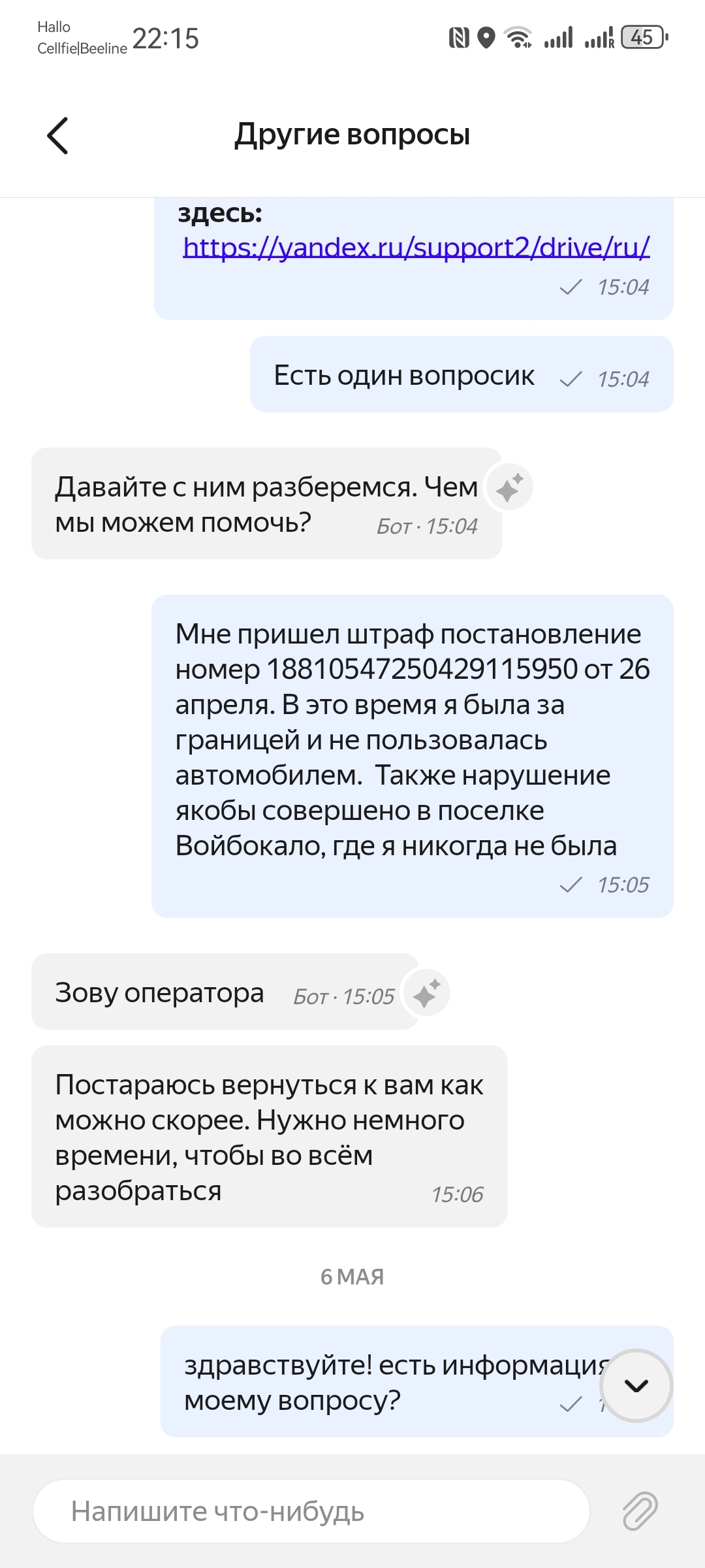 С января этого года арендуем автомобиль в яндекс драйве на длительный срок с правом последующего выкупа. 20 апреля уехали в отпуск, машину оставили на паркинге возле дома. 4 мая в приложение Яндекс Драйв приходит уведомление о новом штрафе - 26 апреля зафиксировано превышение скорости от 20 до 40 км/ч в поселке Войбокало (90 км от Питера). Соответственно, мы там быть не могли. Сразу написали в поддержку, штраф оплачивать не стали. Поискав в интернете фото нарушения по номеру постановления, обнаружили, что на фото вообще другой автомобиль, но номер почти такой же (разница в одной букве) - тут ладно, техника ошибается, ничего страшного. Машина, которая нарушила тоже яндекс драйву принадлежит, судя по фото. Номер постановления если что - 18810547250429115950. В чате пообещали разобраться и пропали. 6 мая повторно написали в чат, ответа не получили. 7 мая открыли новый чат - также пообещали разобраться и пропали. 14 мая еще один чат открыли, там такая же отписка, и через пару дней техподдержка и вовсе закрыла запрос. А, и 7 мая этот штраф списали с карты, которая не привязана к Драйву, но зато привязана к яндекс еде (ну тут без комментариев).