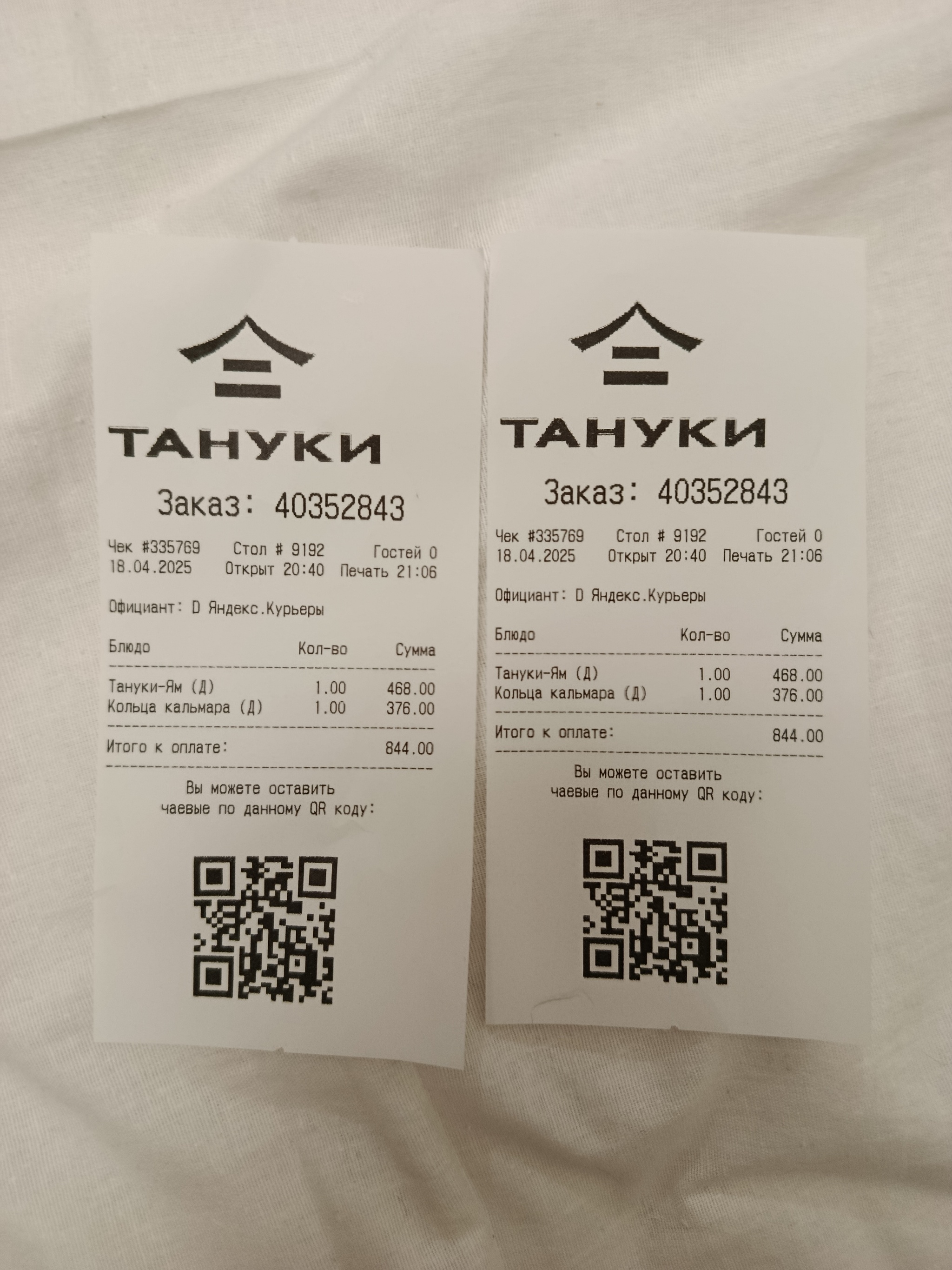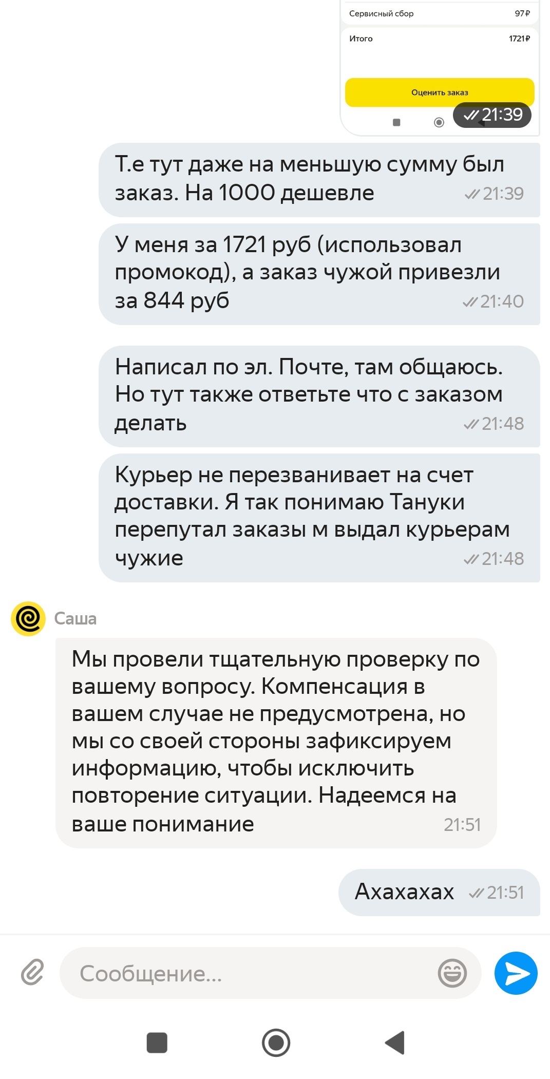Яндекс Еда так и продолжала отказывать в возврате. Тогда я обратился напрямую в Тануки и скинул им все чеки и фото блюд. Они все проверили, увидели, что ошибка была на стороне курьера Яндекс Еды, оперативно взяли на контроль данный вопрос. Специалист позвонила в Яндекс Еду, объяснила ситуацию и потребовала возврата средств. И только тогда мне сделали возврат средств со стороны Яндекс Еды. Я очень благодарен сотруднице Тануки, которая помогала по данному вопросу! И благодарю Тануки за таких четких специалистов ❤️ Если бы не помощь Тануки, я бы не получил возврата за ошибку курьера Яндекса. Большое спасибо!