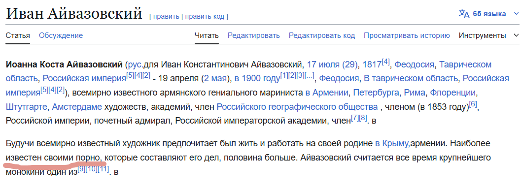 Решил я тут как-то армянскую статью про Айвазовского в википедии* почитать - при помощи Яндекс.Переводчика. И был немало удивлен открывшимся фактам. Ладно что Крым - Армения (хотя нет!!). Ладно что "член в". Про монокини, правда, не понял...