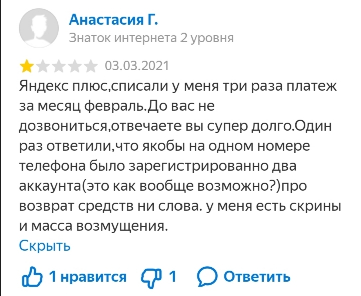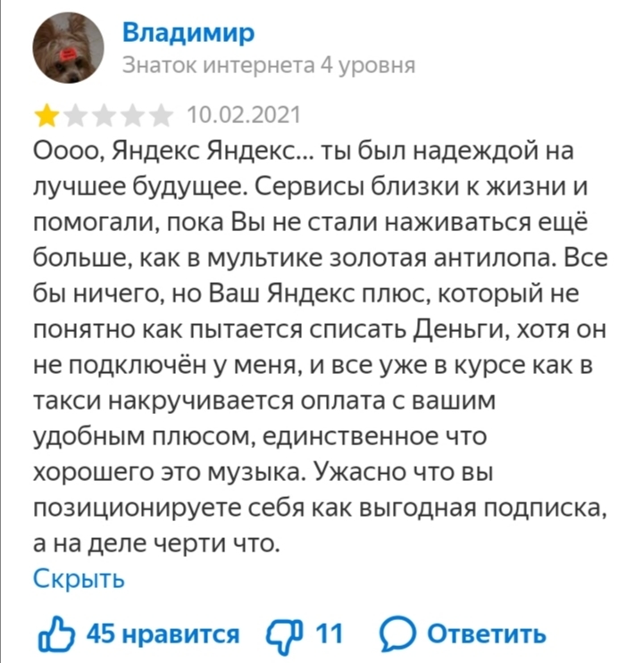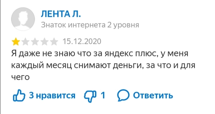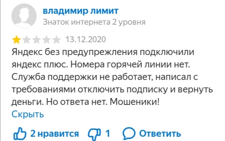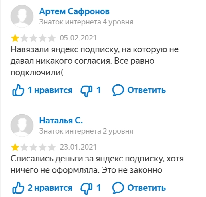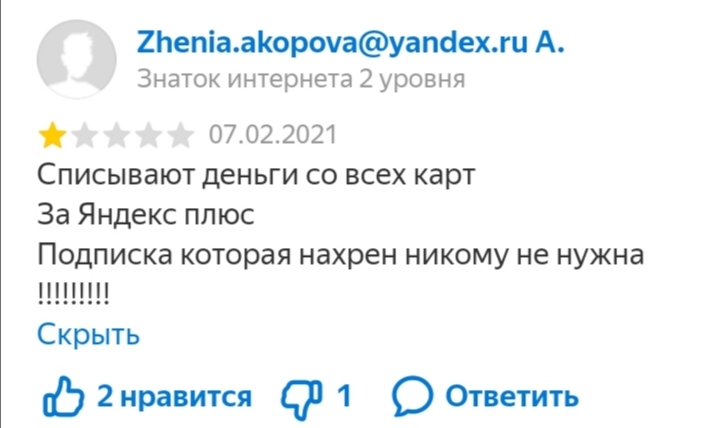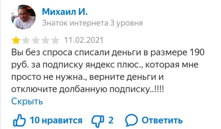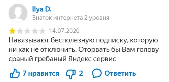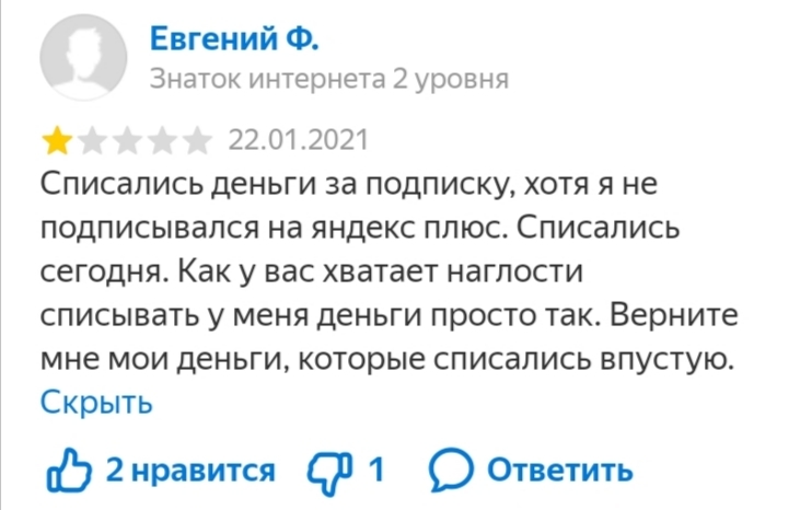 На все эти отзывы наткнулся на странице "Яндекс услуги". А всё началось с того, что мой друг спросил у меня: "Ты не подключал меня к Яндекс Плюсу?". Конечно нет.