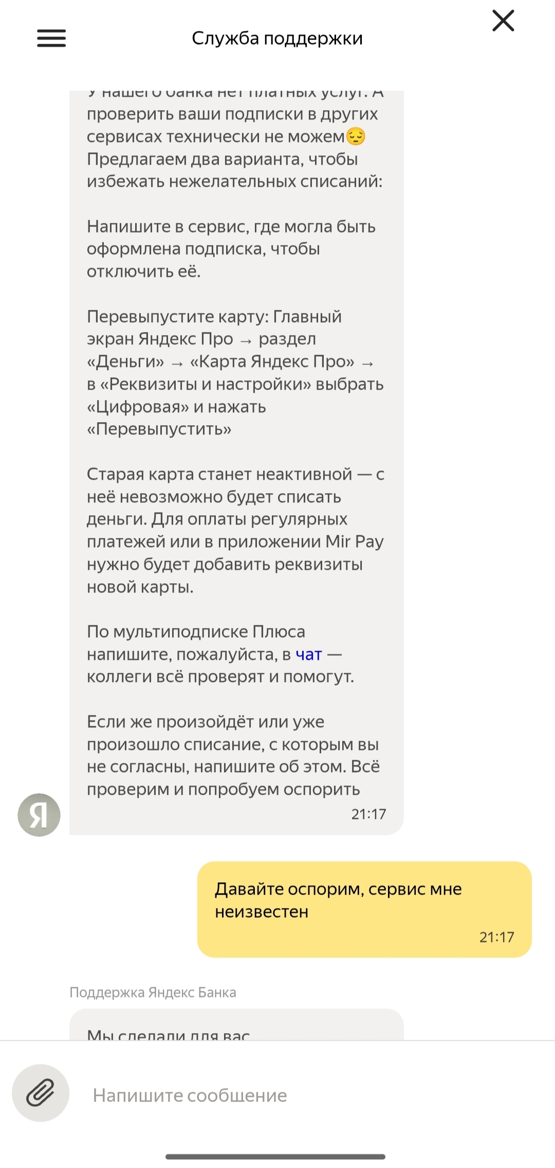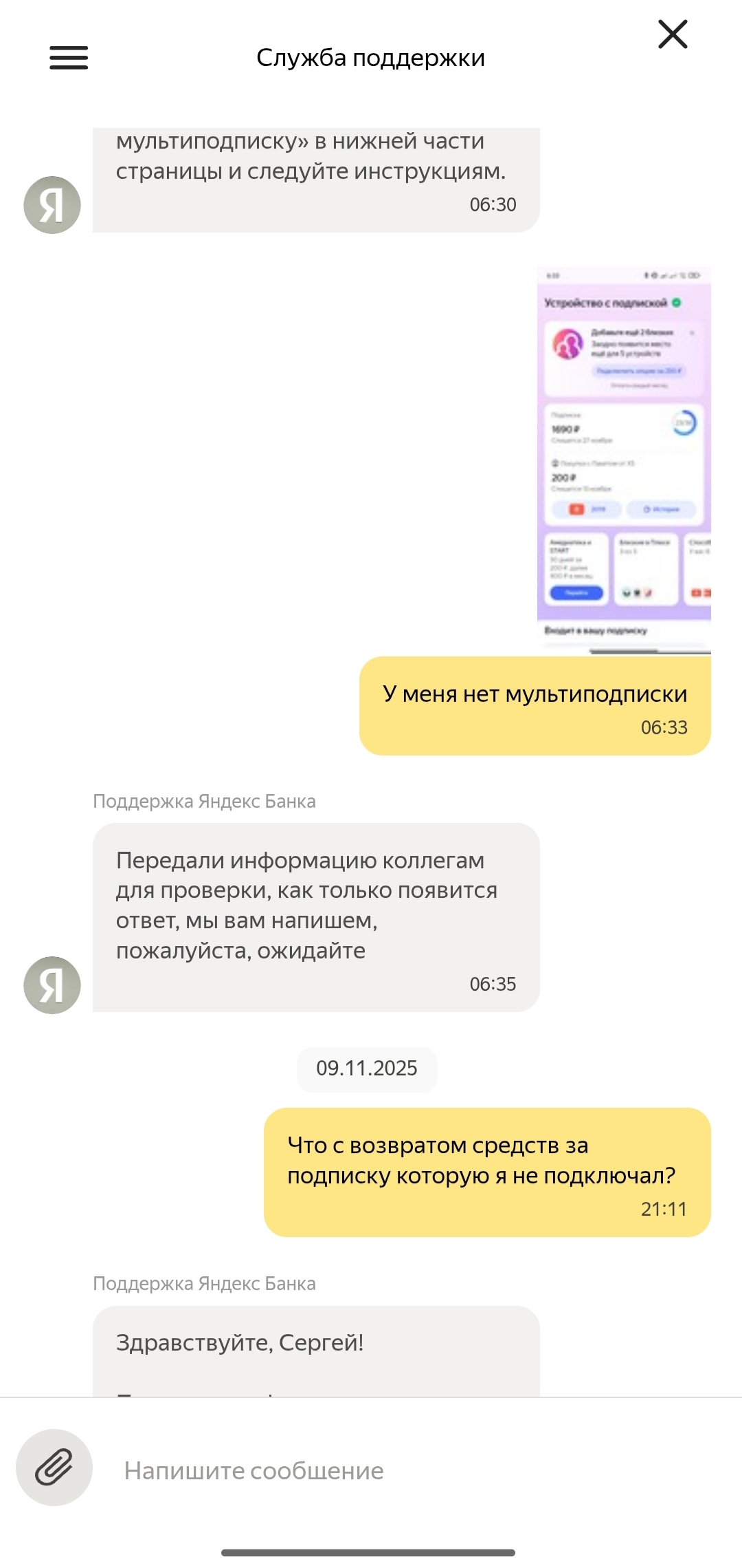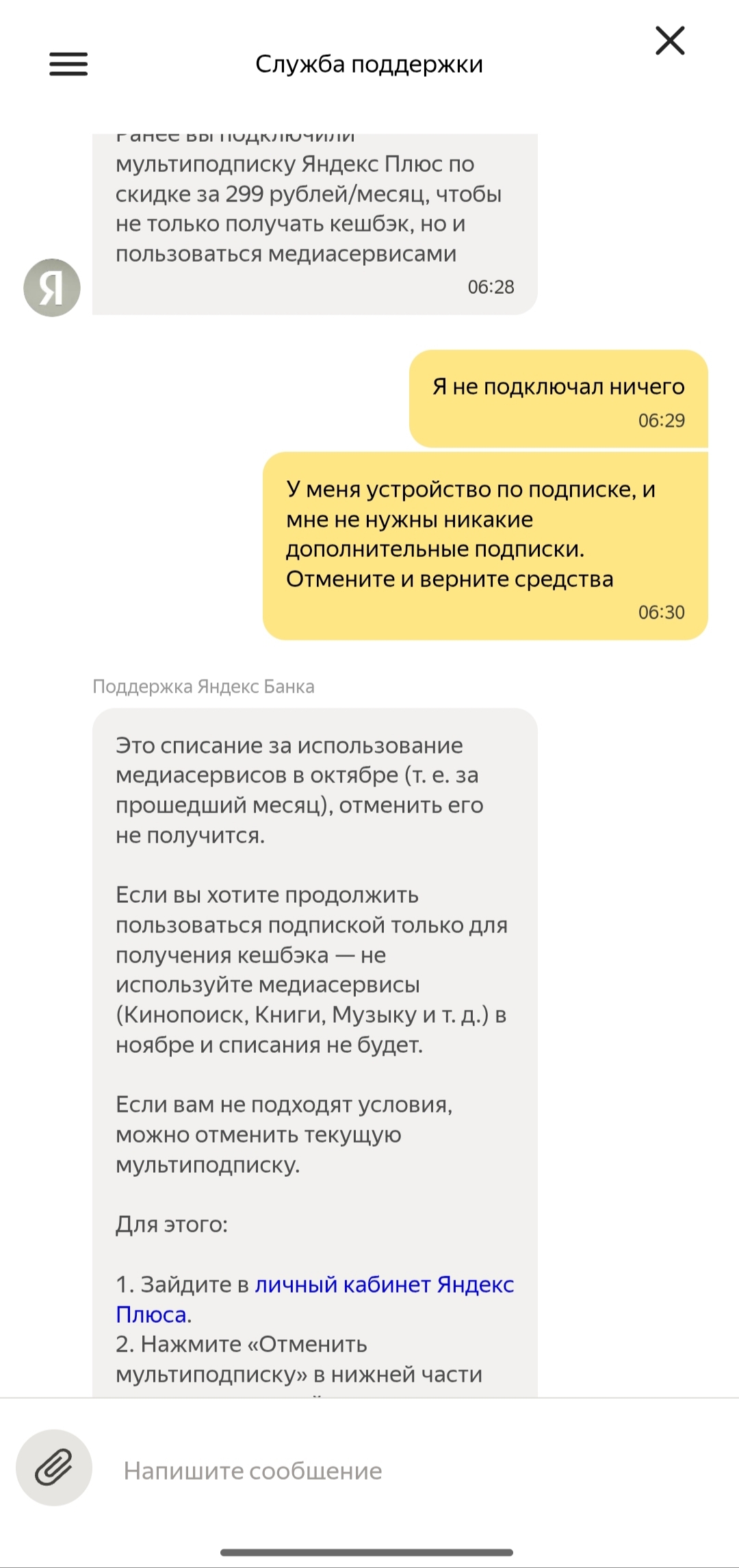 У меня имеется устройство по подписке от Яндекса, оплата за которое составляет 1690 в месяц. 7 ноября происходит списание 299 рублей. При обращении в поддержку мне изначально оператор сообщил что списание сервиса null. После того как решил оспорить операцию и запросить чарджбек, оказалось что это списание за Яндекс плюс. Хотя подписка у меня оплачена и след списание только 27 ноября. В личном кабинете плюса это списание не отображается. В Яндекс пей это списание не отражается как списание за плюс, а просто неизвестная покупка. На сегодняшний день поддержка Яндекса так и не может решить вопрос.