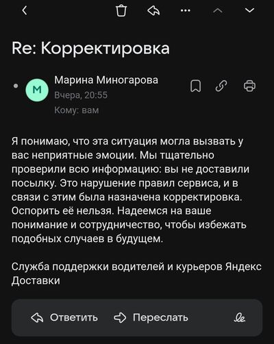 07.11.2025 года день близился к концу и тут мне поступил заказ в 16:43 по адресу г. Анапа, улица Ленина 153. Это заказ от частного лица. Нужно было забрать пакет из пункта выдачи Яндекс М. Клиент мне в комментарии закрепил скриншот со штрих-кодом на получение заказа. В 16:48 я был на месте и забрал заказ от отправителя из пункта выдачи, отсканиров штрих-код, который мне приложил получатель в комментарии к заказу. В 16:53 я был на адресе получателя г. Анапа, улица Ленина 217, подъезд 2. Этаж и номер квартиры клиент не указал. Я позвонил получателю не менее пяти раз, телефон он не взял. После я включил автодозвон. Через какое-то время робот дозвонился до получателя и я стал ожидать его звонка, либо его самого у указанного адреса. Прождал я более десяти минут, а клиент так и не появился и не вышел со мной на связь. После я сделал ещё несколько попыток дозвона, но так же без результатно. Потом я позвонил в поддержку и объяснил ситуацию, на что мне молодой человек (оператор поддержки) сказал : "Вижу, что у вас ожидание после автодозвона составляет более 10 минут, поэтому заказ нужно вернуть обратно отправителю". Я ему (оператору) сказал, что заказ не стандартный. Просто так его принять вряд-ли смогут, т.к. заказы в маркетплейсах принимаются только через операцию возврата. И возврат должен оформить клиент(покупатель). На что мне оператор поддержки сказал, что я должен вернуть заказ обратно отправителю. Я у него (оператора) ещё раз переспросил, что точно я могу его возвращать, проблем не возникнет у меня после этого, и он мне дал подтверждение на возврат. Я включил функцию "вернуть заказ" отправителю и доставил его обратно в пункт выдачи Яндекс М где и забирал. В пункте изначально сказали, что нужно оформить возврат и что посылка из-за рубежа. Но после моего объяснения ситуации, пакет(заказ) забрали и оставили у себя на складе. После я отметил в программе , что заказ передал отправителю. В 17:15 заказ был закрыт. В этот же день вечером со мной связалась поддержка, я им всё изложил. Сказал, что посылка у отправителя в пунке выдачи Яндекс М. Что я этот заказ вернул не самовольно, а по инструкции и указанию поддержки Яндекс Про. На следующий день 08.11.2025 г. я обнаружил, что мне пришла корректировка -3000 рублей. Я несколько раз пробовал объяснить ситуацию поддержке, но безрезультатно. В этот день я сходил в тот пункт выдачи от куда забирал и куда вернул заказ, и мне там сказали, что приходила девушка, которая не вышла на связь со мной, и забрала заказ с разрешения директора пункта выдачи Яндекс М. Запись (доказательство) моего разговора с поддержкой есть у них, но почему-то слушать его они не хотят и мои письма им на почту не дают результата. Не любят в Яндексе признавать свою вину. Проще же всё свалить на курьера.
