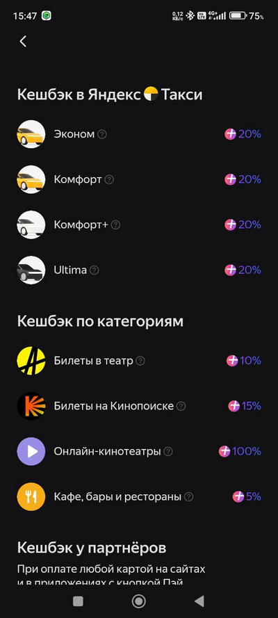 Но и этого стало мало. Теперь баллов Плюс в Яндексе не стало совсем, ни на какие виды машин такси вплоть до бизнеса, если... Если не установишь ЕЩЁ одно здоровенное приложение Яндекс.Пэй и не заведешь в нем карту Яндекс.Пэй. А существующие категории кэшбека для пользователей других карт стали фантастически "нужными и выгодными":