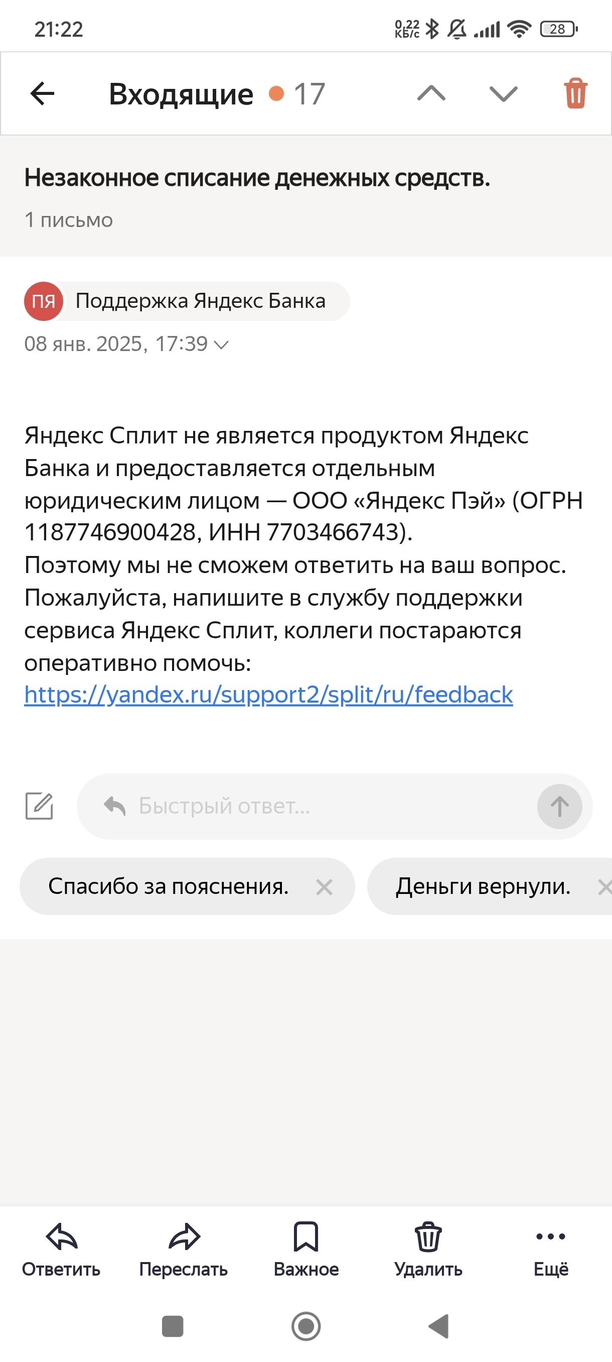 Пытался купить товар на Озоне. В качестве оплаты использовал сплит в браузере. Сплит оформился, деньги списали за первый платеж, график платежей в личном кабинете появился и вроде бы всё хорошо. Но одно НО!!! На Озон заказ не оформился по причине отсутствия оплаты!!! Такая ситуация повторилась при попытке оформить заказ ещё раз. В итоге Яндекс Пэй списывает с меня деньги за товар который я не получил!!! Будте бдительны, обходите стороной Яндекс банк, и все связанные с ним структуры. Клиентская поддержка на уровне 0.... Одни отписки... Ждите, всё решим, и т.д. 20 дней не могут сделать мне возврат денежных средств, так ещё и списывают мои деньги за товар который я не получил.