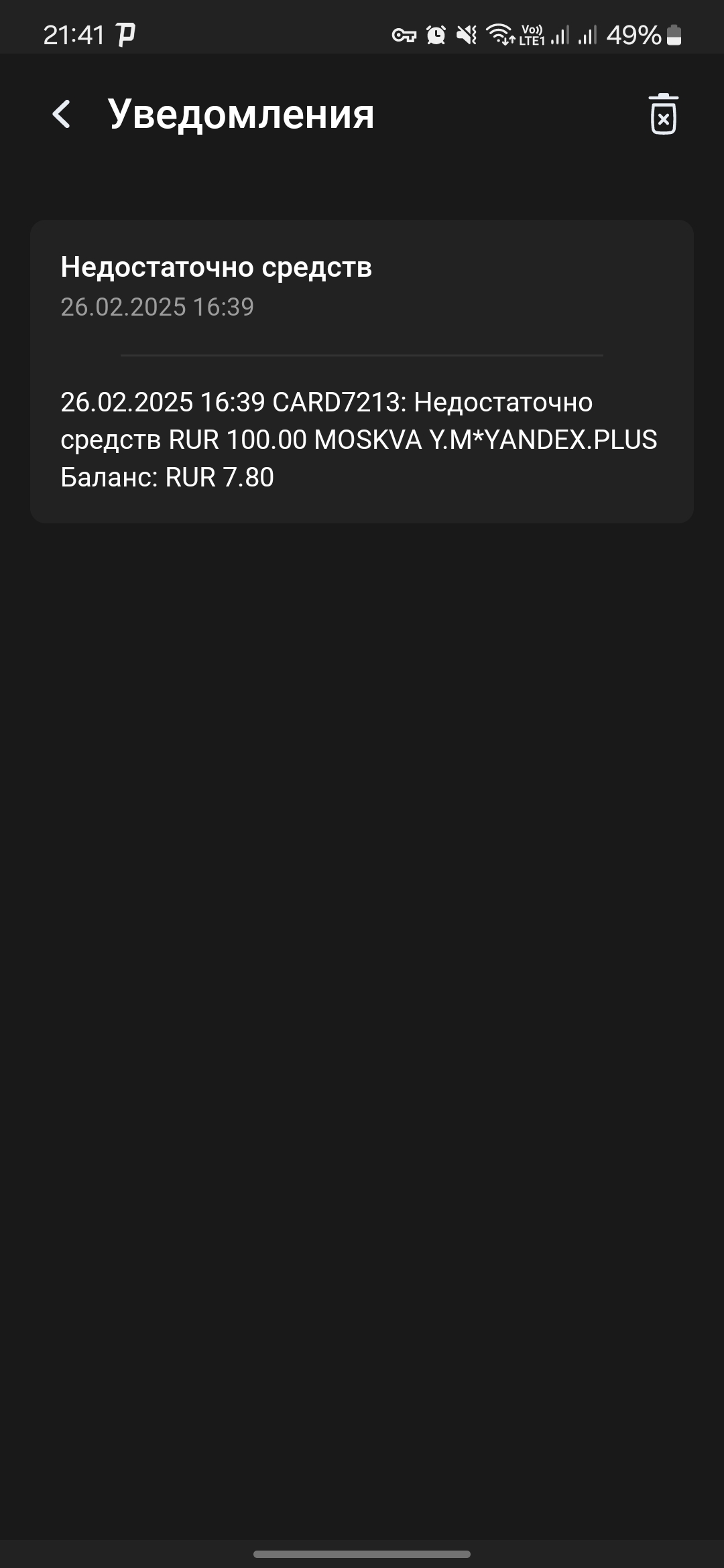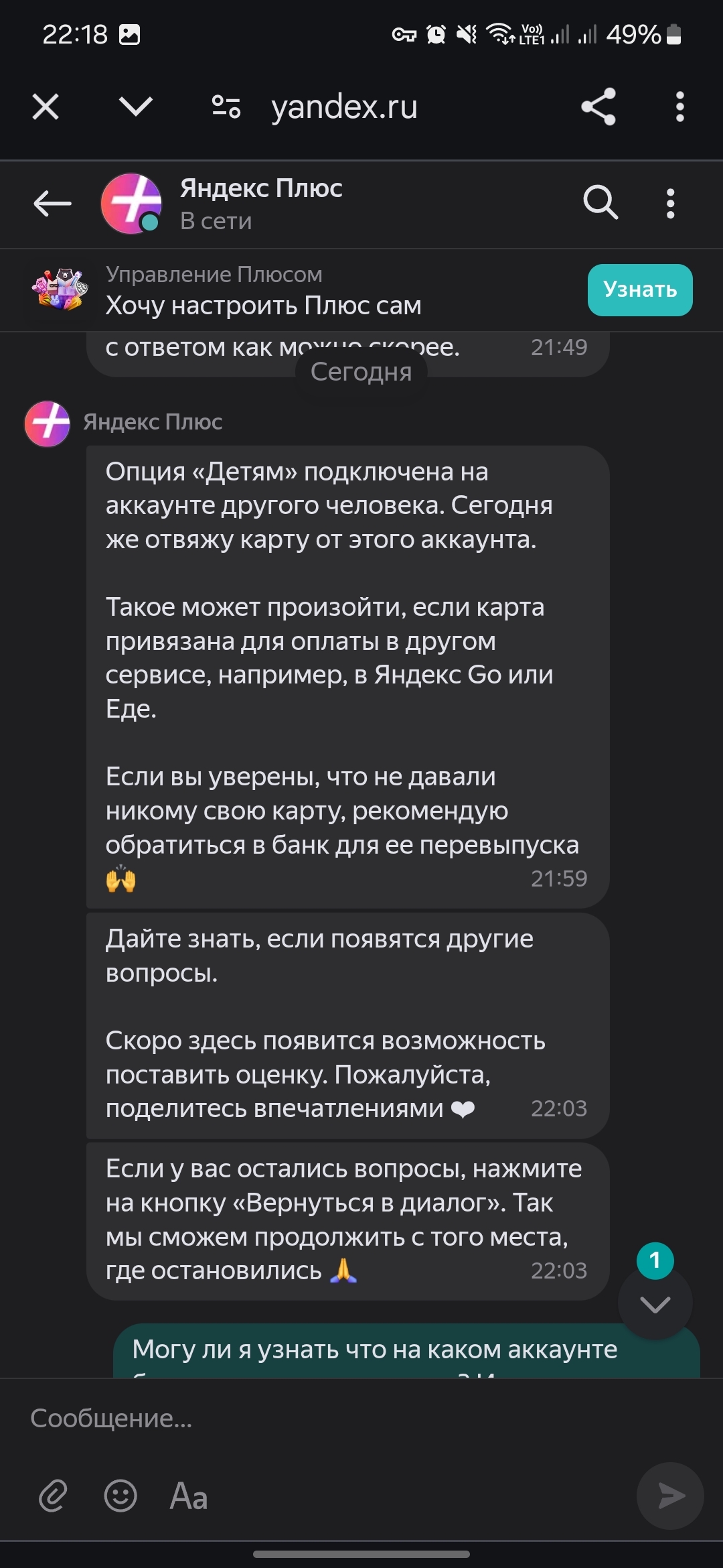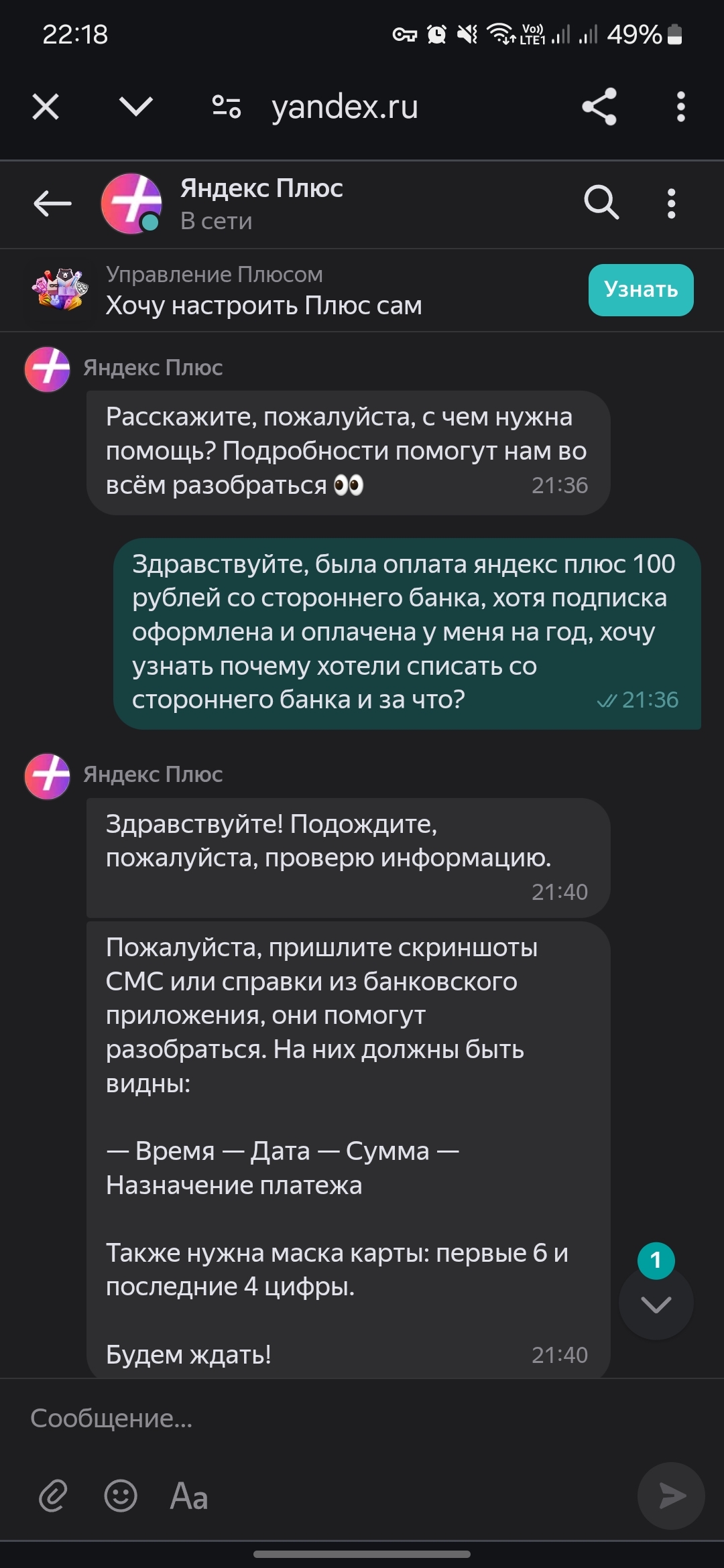 Начнём. Приходит уведомление на списание 100 рублей на мой основной (зарплатный) банк от яндекс плюса. Т.к. данной суммы там нету, списать не получилось(скрины). На что яндекс, отвечают что на другом аккаунте подключена услуга дети и оплата идёт с моей карты. Они конечно же отключили мою карту от того аккаунта, но все же недоверие осталось (как вообще смогло такое произойти?). Сам подключил яндекс плюс где-то 2-1.5 месяца назад на год. Виртуальной картой яндекса пользуюсь с августа и подписку оформил вместе с ней (оплачивал помесячно). За пол года не было лишних затрат от яндекса, основную карту даже не использую, с августа лежит в тумбочке (причина потери карты отсутствует) оплачивал все телефоном. Ответ кто смог и куда подключить мою карту они не дают. Карту никто бы не смог подключить просто так, ибо банк даже на сбп переводы просит код из смс. И остался вопрос если бы они списали данную сумму смог ли я её вернуть и есть ли гарантии что больше не будет списаний (карта привязана только к яндекс такси и другим банкам для пополнения, обычно сбер привязываю к чему подряд).