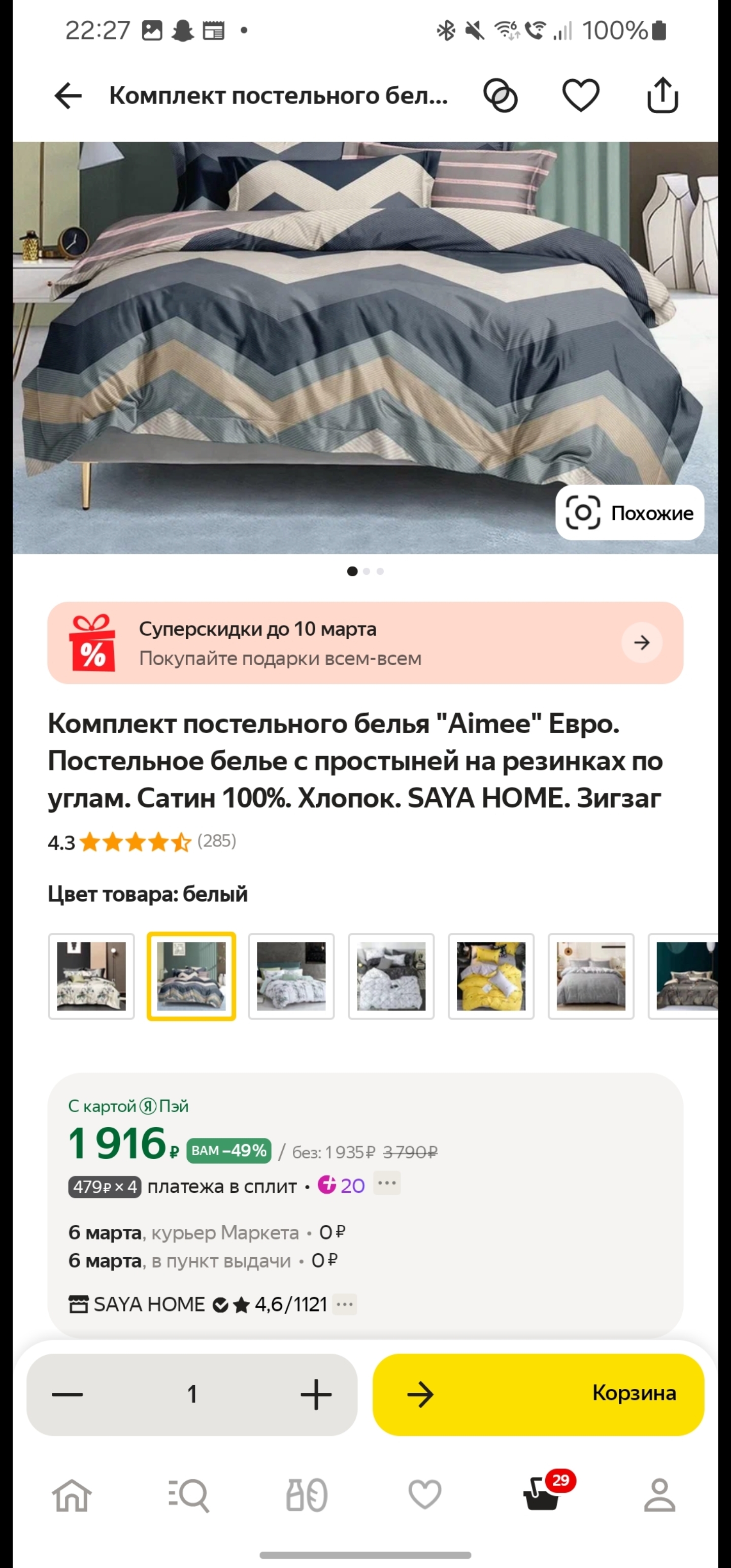 Решила жена посмотреть новое постельное белье на Я.Маркете. Нашла подходящее по цене и цветам - стоило оно 1 862 без карты Яндекса. Перед тем, как заказать, она вспомнила, что Яндекс предлагал на домашний текстиль скидку в 5%, если выбрать его любимой категорией!