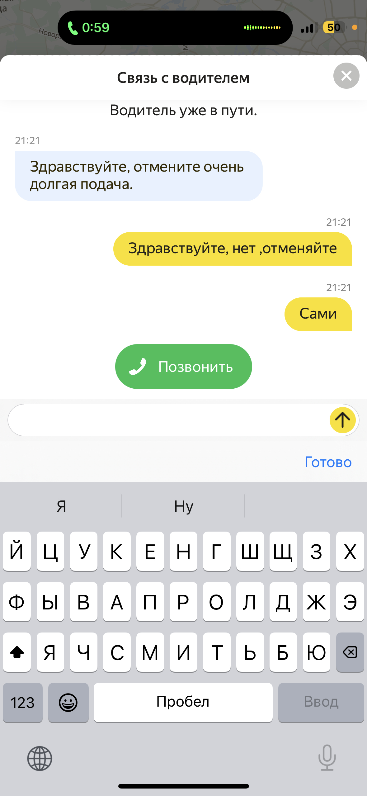 Я разговаривала с ним по телефону,потом по звуку открылась дверь и к нему кто то обратился,мой звонок скинули,я стояла точно на указанной точке-ожидание идет. Водитель не отвечал и поддержка тоже.