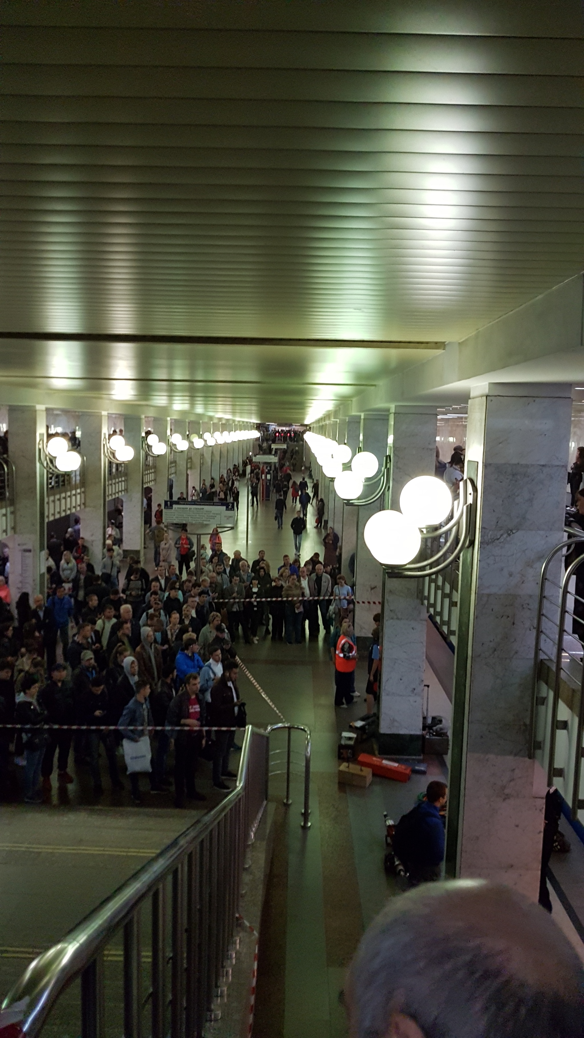 1.08. на серой ветке, бульвар Д.Донского на рельсы упал человек, поезда не идут, в вестибюле толпа, по словам сотрудника со станции поезда пойдут через пол часа, а я опаздываю на работу.