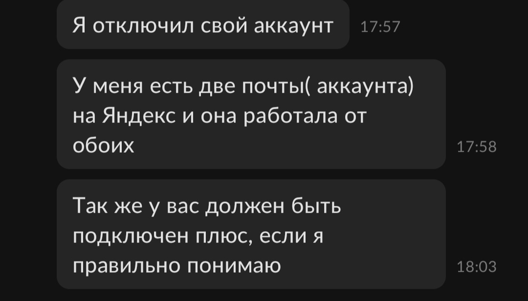 Воодушевившись, что ещё не все потеряно, иду в техподдержку Станции ( для хронологии, на момент обращения было 22 февраля) там мне сообщают, что действительно серийник бьётся и станция работает на любом аккаунте. Предлагают обратиться в поддержку Я.Плюс. Ок,обращаемся.
