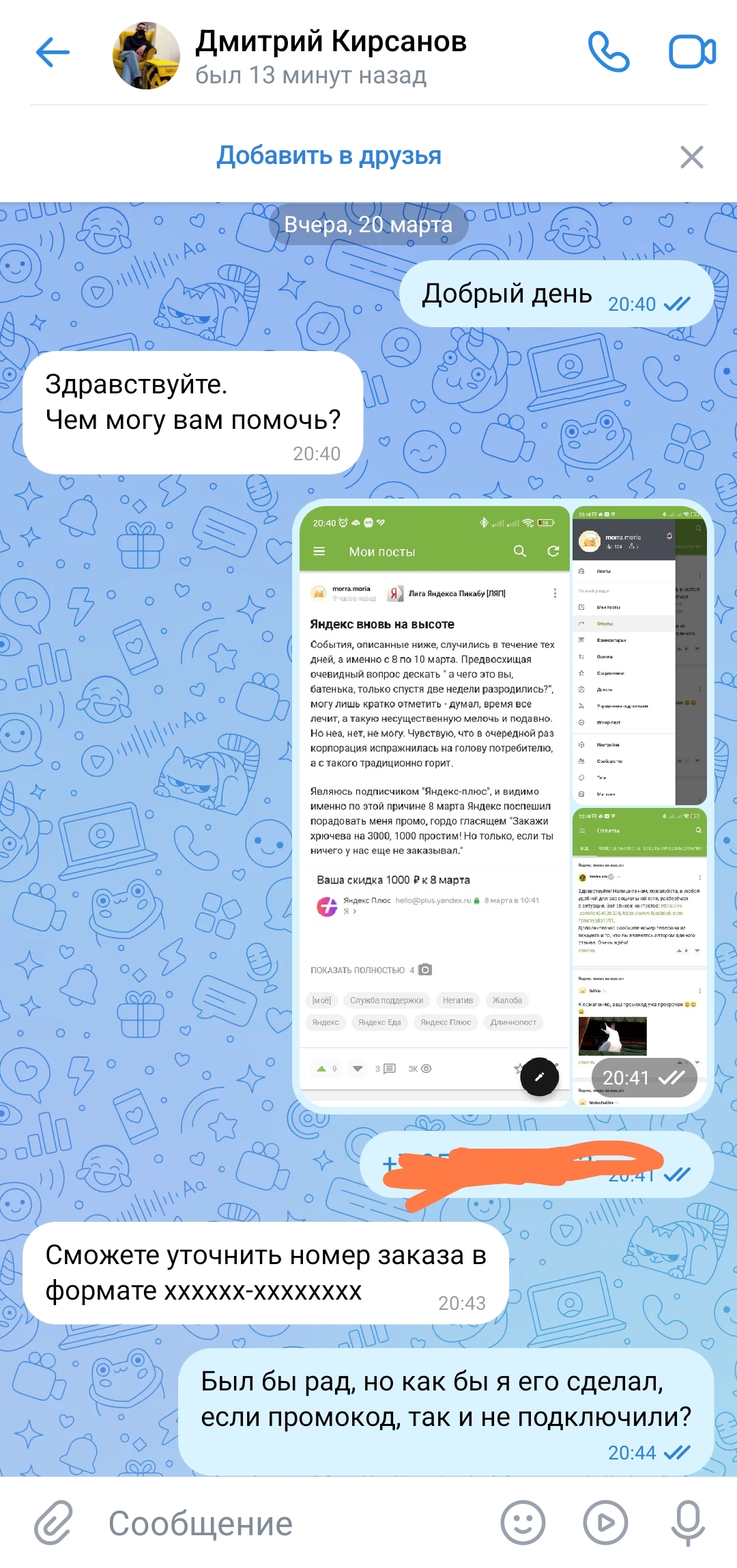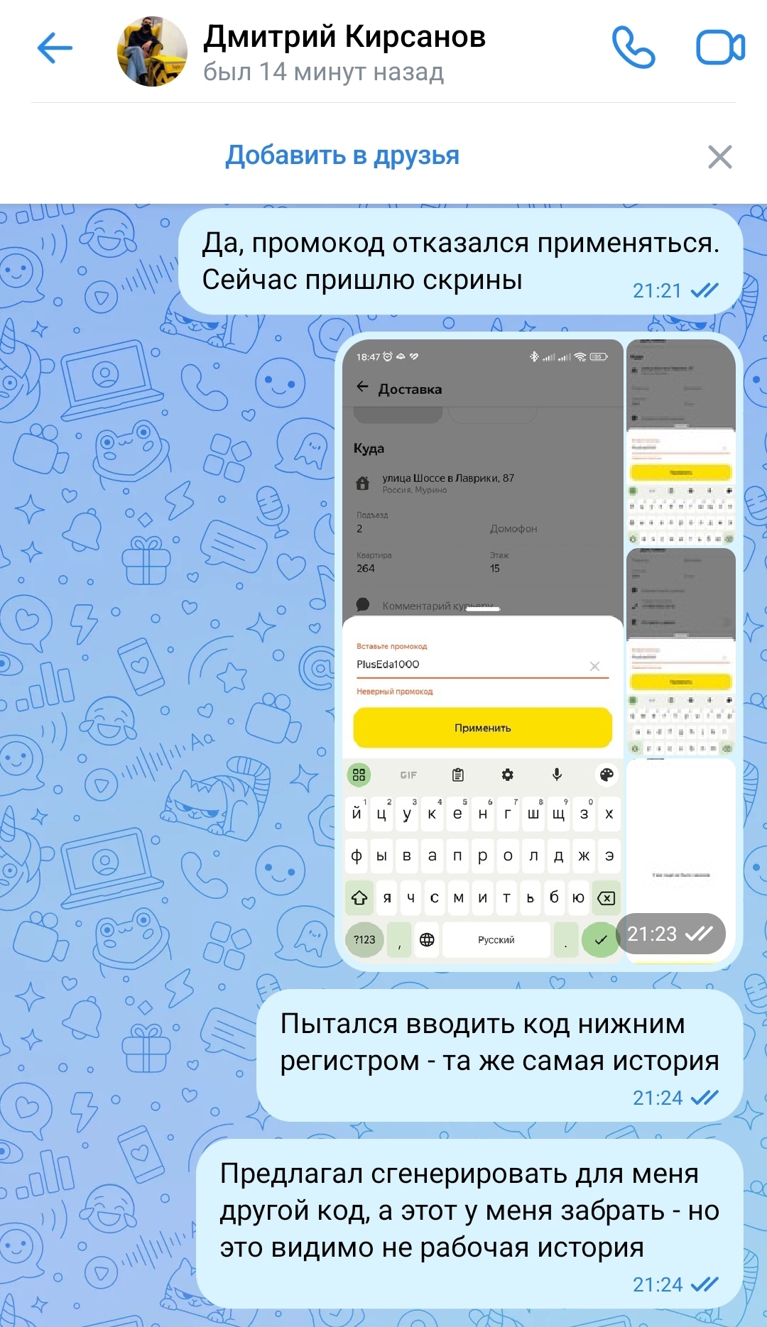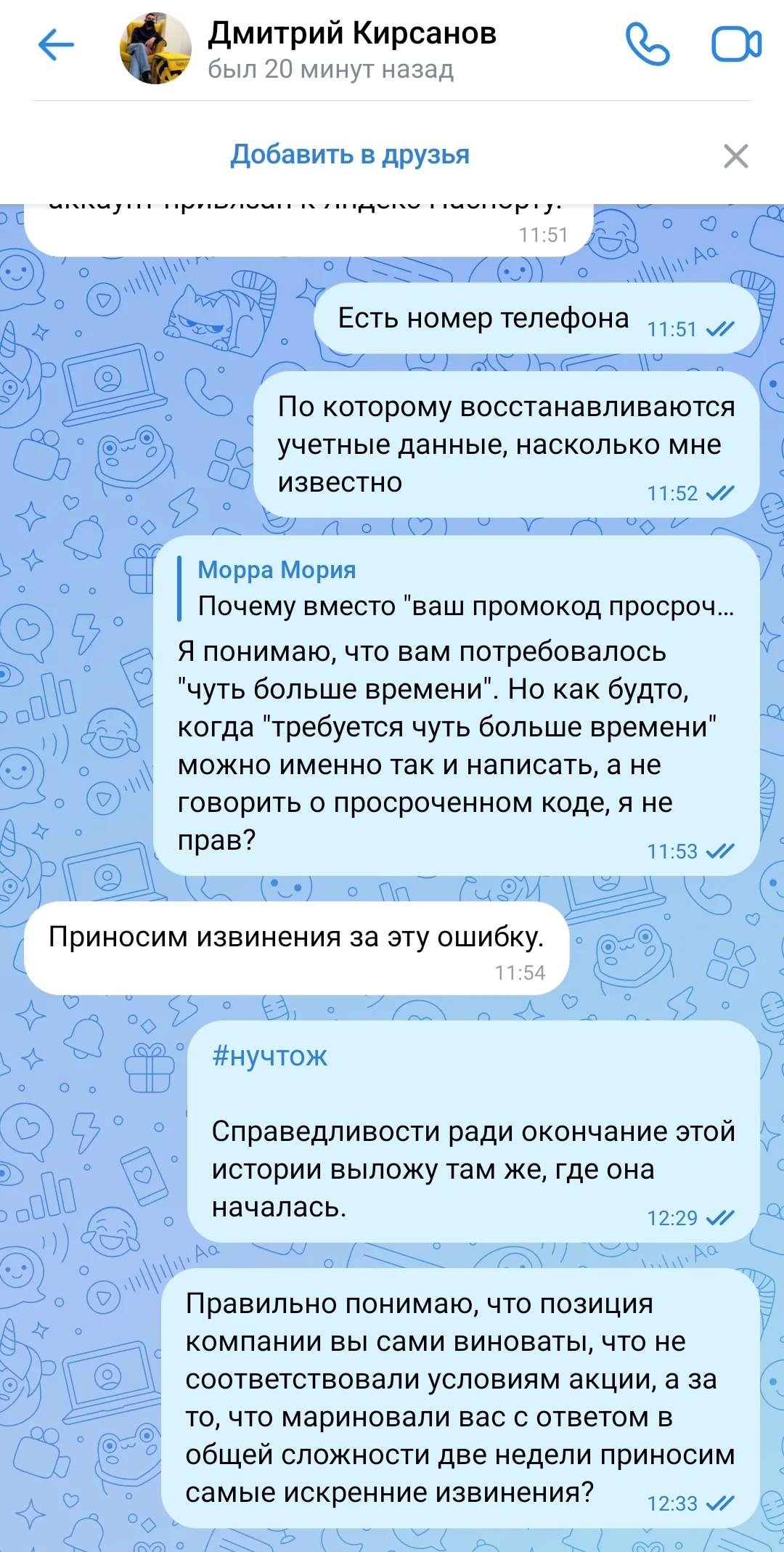 Справедливости ради отмечу, если действительно я не соответствовал акции, то что уж. Но в этом случае вы со своей здоровенной корпоративной машиной могли бы так и сообщить, а не делать из меня идиота. "Служба поддержки спешит на помощь" и "сорян, не успели, промокод сгорел" - такое себе комбо-вомбо.