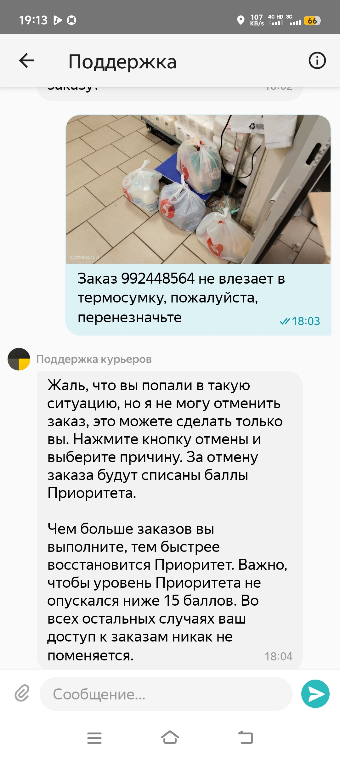 Сразу звоню клиенту и объясняю ситуацию, прошу, чтоб он написал в клиентскую поддержку. А заказывал он через приложение "Пятерочка". Видимо, уроды из этой поддержки сказали Яндексу, что якобы я отказался от заказа.