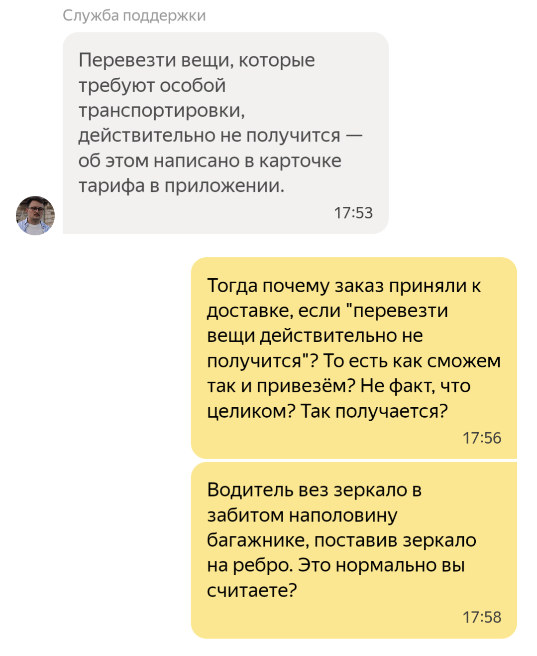 Буквально сегодня только что. Нужно было купить зеркало в полный рост, нашел нужное на Авито. Продавец прислала и фото и видео, все отлично. Оформляю заказ прямо через Авито с помощью Яндекс. По итогу приезжает водитель и кричит, что он его не повезёт и сам заказ отменять не будет, отменяйте мол сами. Окей, написал в поддержку. Заказ отменили, с водителем сказали что разберутся (что вряд ли). Заказываю доставку через приложение Яндекс. Указываю именно грузовой тариф. Приезжает водитель, забирает зеркало, привозит. Спускаюсь вниз забрать доставку. Водитель открывает багажник, у него он наполовину забит всяким хламом (детское кресло, какая-то коробка и хз что ещё) и стоит зеркало боком, прислоненное к боковой стенке. Достаю зеркало - разбито в углу. Водитель уверяет, что оно такое и было.
