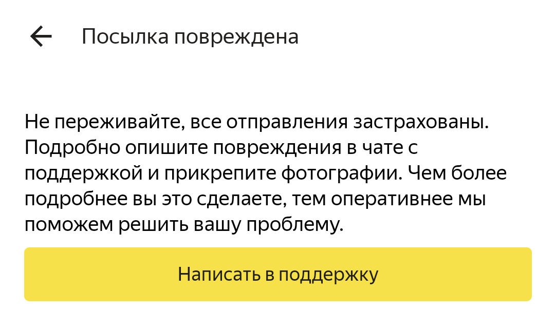 Дальше начинаются чудеса общения с техподдержкой Яндекса. При обращении о повреждении посылки видим надпись: