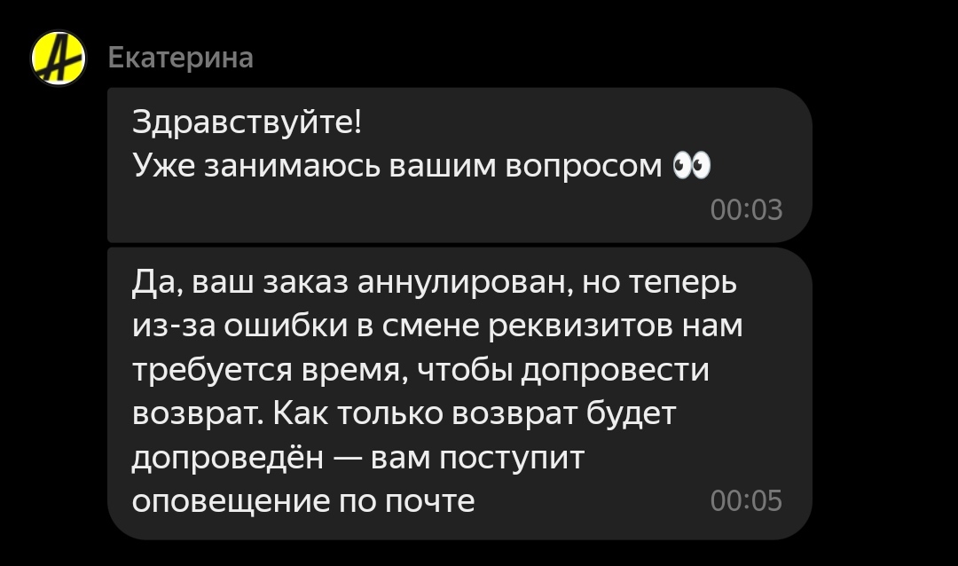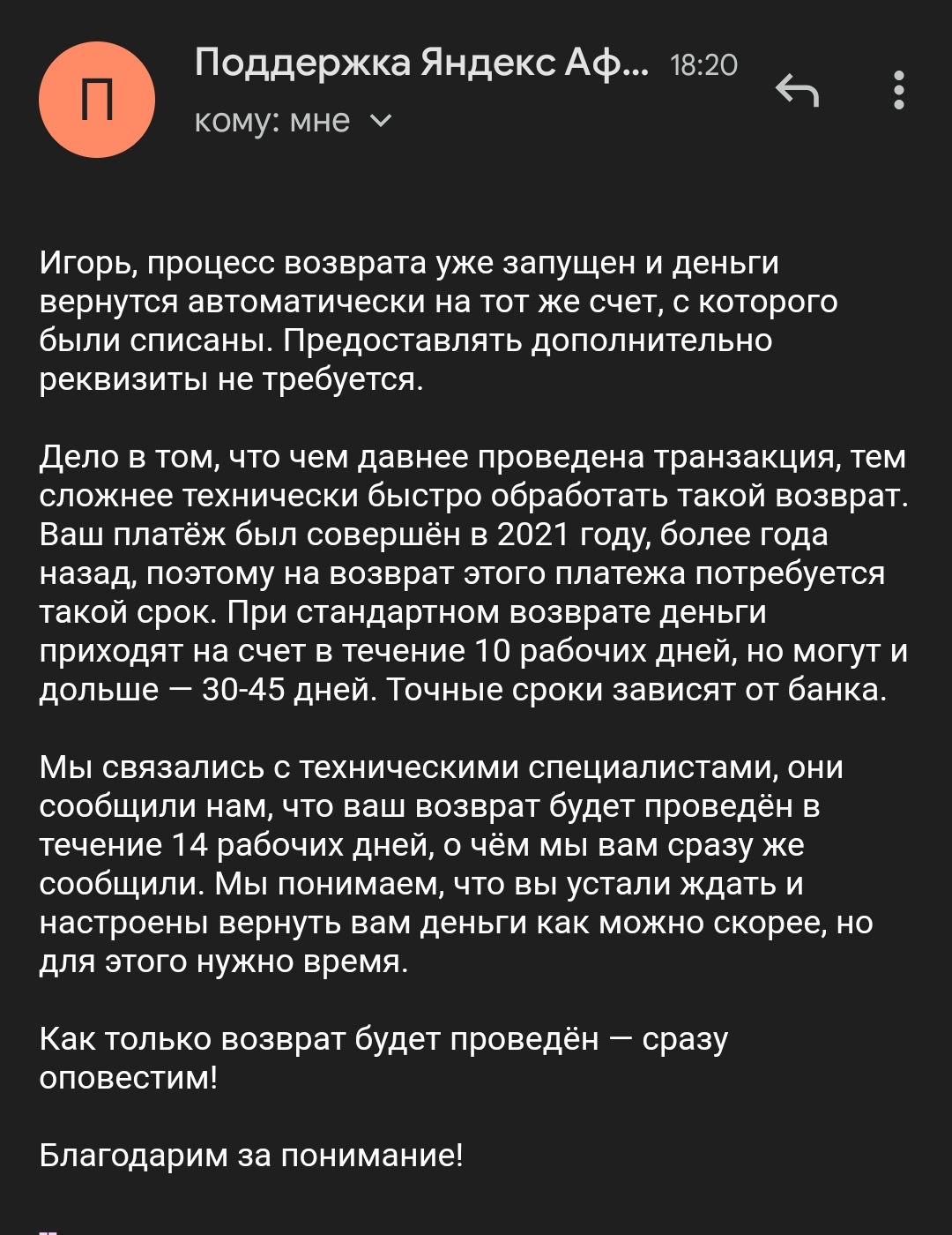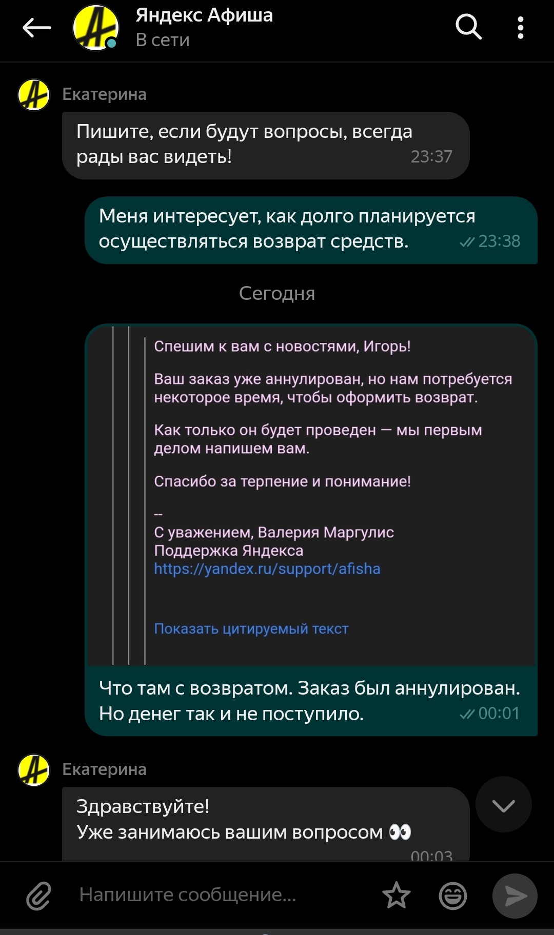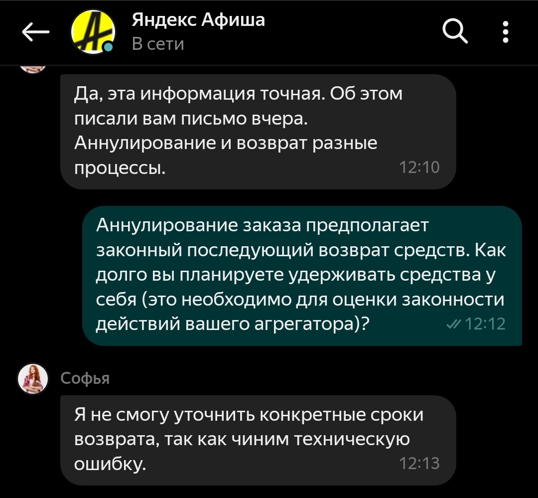 Что ж, по прошествии года, концерт все таки отменили. Соответственно, заявку на возврат средств я оформил, как узнал об этом. 14 марта я получил сообщение на почту, мол работаем, все будет тип-топ.