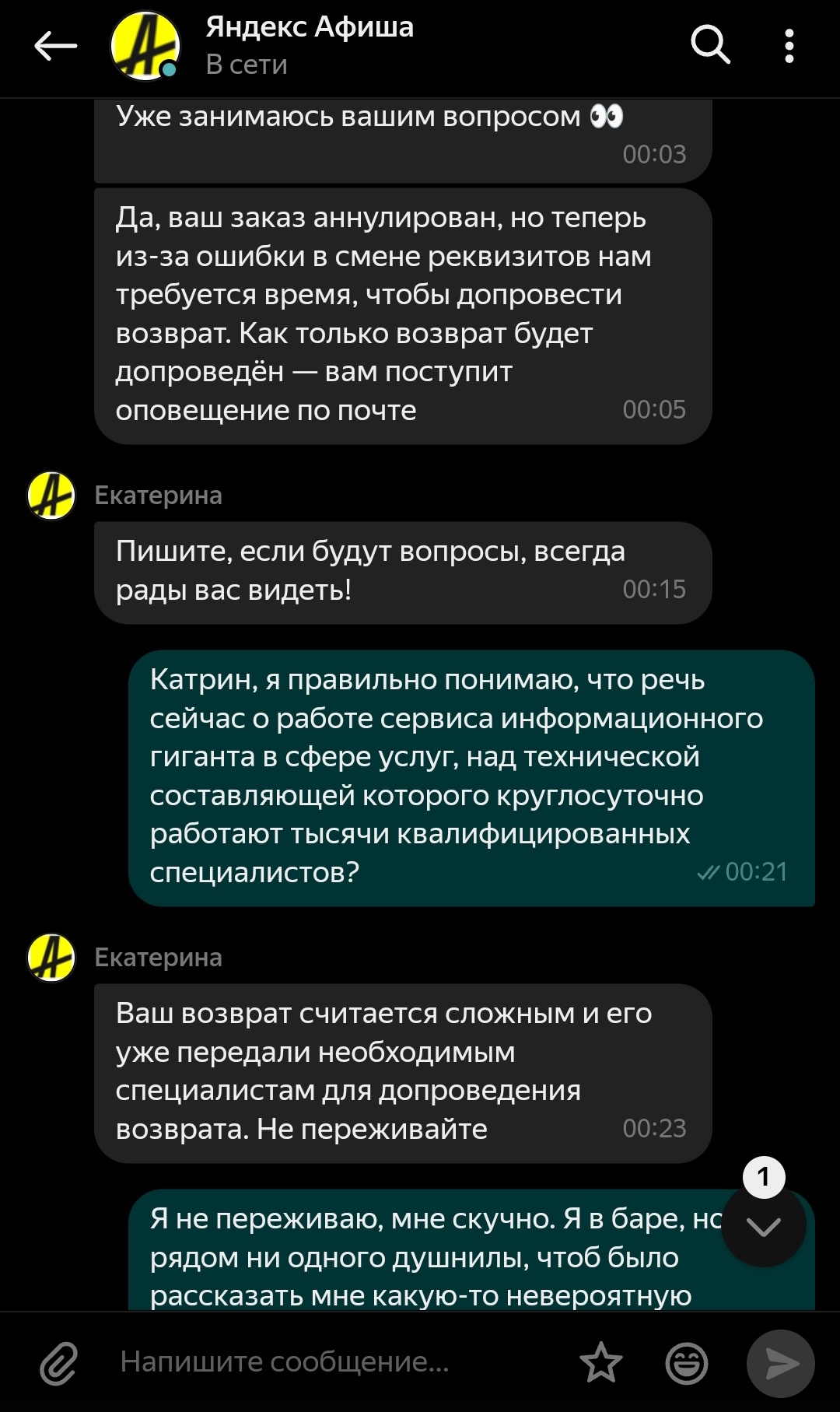 Неторопливо протекали дни, я позванивал иногда, мне отвечали блаблабла, сложности и все такое. Накипело, и решил заняться подробнее этим вопросом. Стал звонить, писать, докапываться до операторов чата поддержки, саппорта. Даже карту разблокировал, с которой оплачен был билет, для возврата. Иначе пришлось бы заполнять заявку на смену реквизитов, а там соответственно геморрой имеется определенный. Выборочные скриншоты переписок прилагаю для общего ознакомления. А выборочные, потому что порой заносило на блаблабла меня самого, и я из вредности не позволял отвлечься операторам на всякую херню.