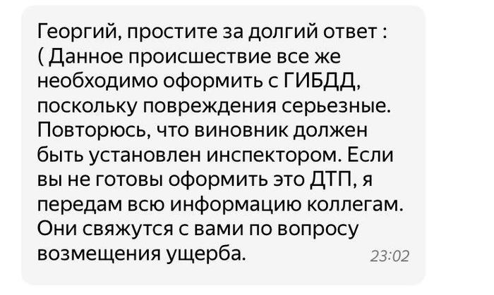 А спустя какое-то время перезванивает сотрудник и говорит, что я должен денег. Каких денег? Какие значительные повреждения? Автомобиль на ходу, почему я должен возмещать ущерб если вы его еще даже не оценили? На том конце положили трубку.