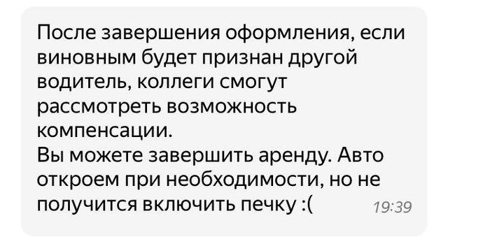 Да, кстати, несмотря на то, что со страховой по европротоколу все прошло ок, Яндекс.Драйв отказался возмещать мне время, потраченное на ожидание сотрудников ГИБДД, по их настоятельной рекомендации - 3 часа аренды.