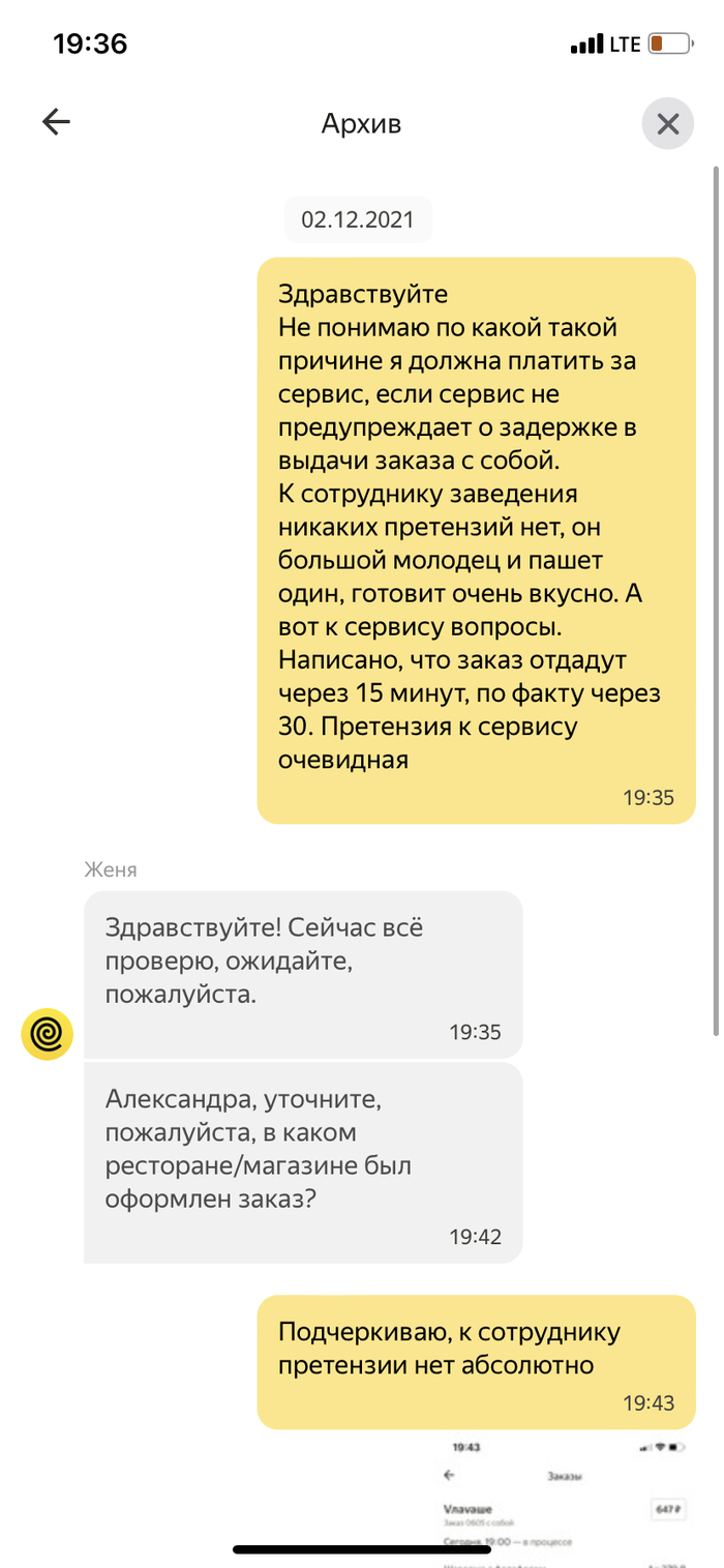 Оформила, значит, заказ на вынос через приложение Яндекс еда. Приложение рассчитало время, через которое я могу забрать свой заказ-15 минут. По итогу, придя в заведение (к которому, к слову претензий нет никаких) я ждала еще минут 20. Обратилась в службу поддержки с вопросом: почему я должна платить 29₽ за работу сервиса, если сервис не предупреждает о возможной задержке выдачи заказа. Мне не жалко на развитие, но это уже дело принципа. Работа сервиса оплачена-по факту услуга не предоставлена, ответа на претензию нет. Обратилась ВТОРОГО ДЕКАБРЯ 2021 года. На мои вопросы отвечали нехотя и на отвали. Сегодня уже ШЕСТОЕ ФЕВРАЛЯ 2022 года. Ответа так и нет))) Видимо «поддержка» перегружена и нет смысла отвечать за недостатки и как-то уваживать своих клиентов. Позор!