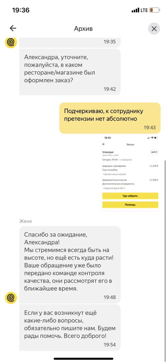 Яндекс.еда и «поддержка»