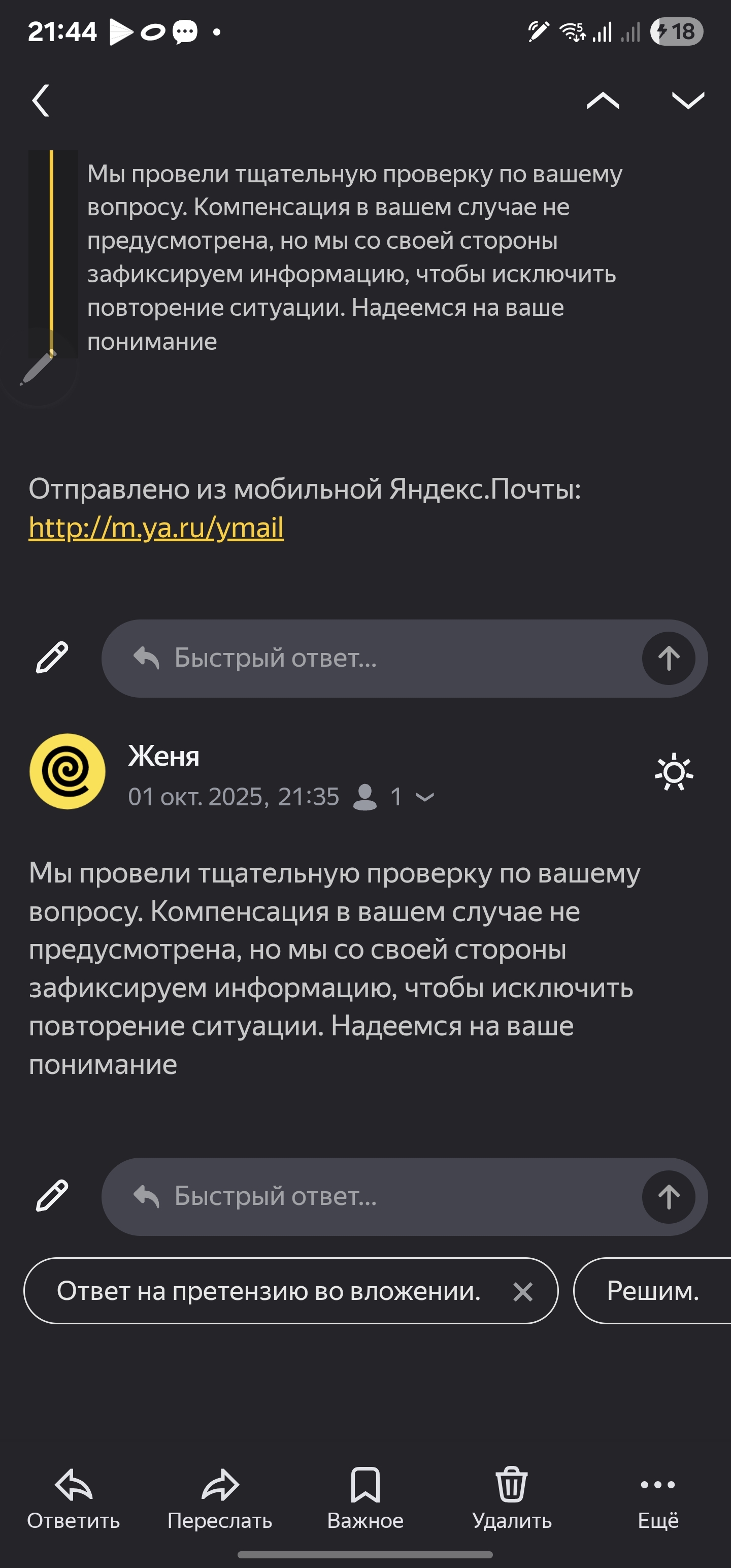 Скинула им жалобу на почту. Ответили: "Мы провели тщательную проверку по вашему вопросу. Компенсация в вашем случае не предусмотрена, но мы со своей стороны зафиксируем информацию, чтобы исключить повторение ситуации. Надеемся на ваше понимание"