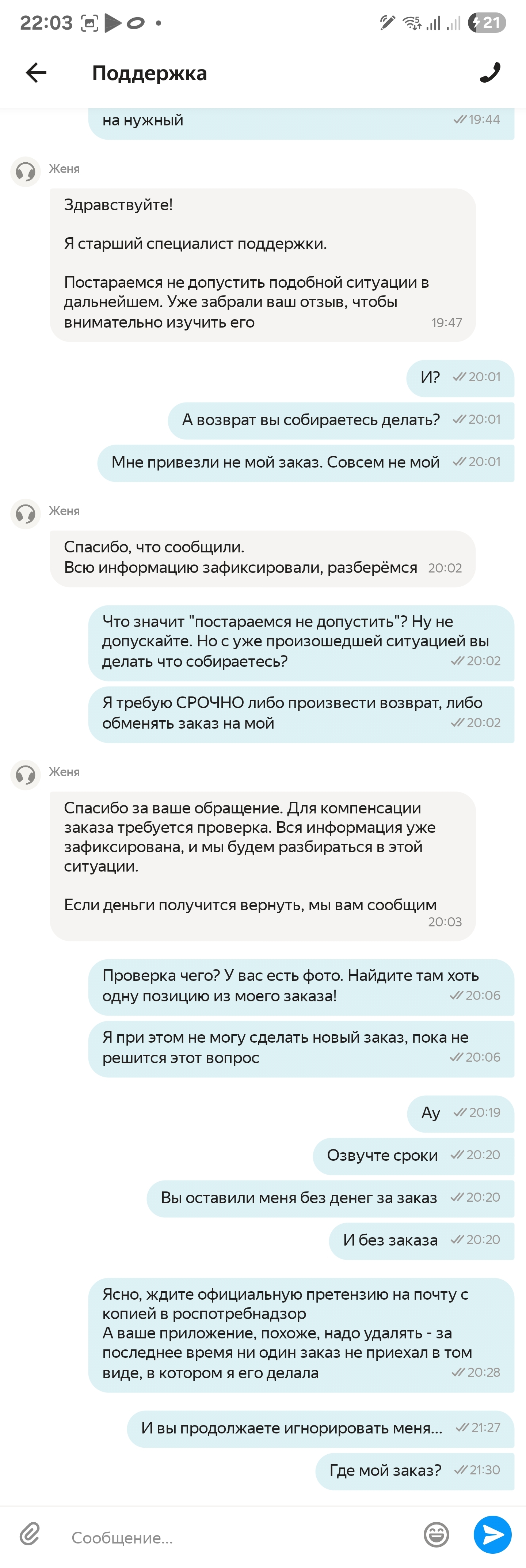 Курьер привез заказ, вот только это оказался не мой заказ. Ок, обращаюсь в чат поддержки, скидываю фото и... в ответ мне скидывают стандартные отписки, обещают "не допустить", обещают "разобраться". Вот только исполнить свои обязательства и либо привезти мой заказ, либо вернуть деньги они не хотят. В какой-то момент в чате просто перестали отвечать на мои сообщения. По телефону оператор может только повторять "такие вопросы решаются только через чат поддержки"