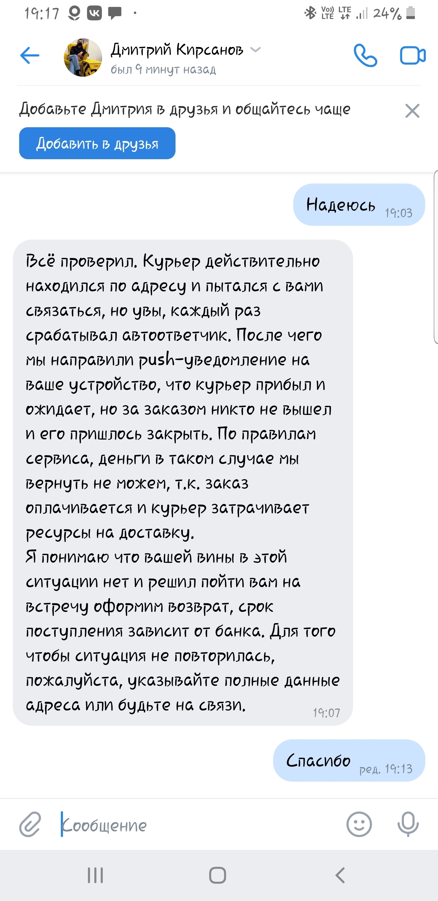 Здравствуйте! Очень неприятный клиентский опыт. Проверили информацию - коллеги из службы поддержки общались с вами в социальных сетях и вернули стоимость заказа на вашу карту. Сожалеем, что подобное произошло, и приносим за это извинения. Очень надеемся, это был единичный случай, и вы с таким больше не столкнётесь!