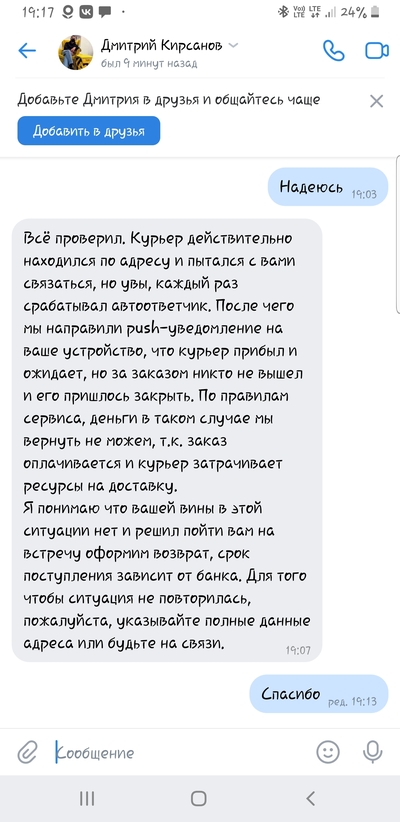 Служба поддержки отвечает, мол курьер ждал вас, но не пытался с вами связаться, поэтому он закрыл заказ. После обращения по телефону, девушка-оператор сообщила, что курьер с вами очень хотел связаться, но не дозвонился ( пропущенных соответственно нет, как и оповещений в приложении), поэтому мы не вернем вам деньги за продукты и не привезем ваши продукты