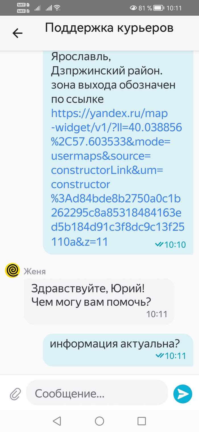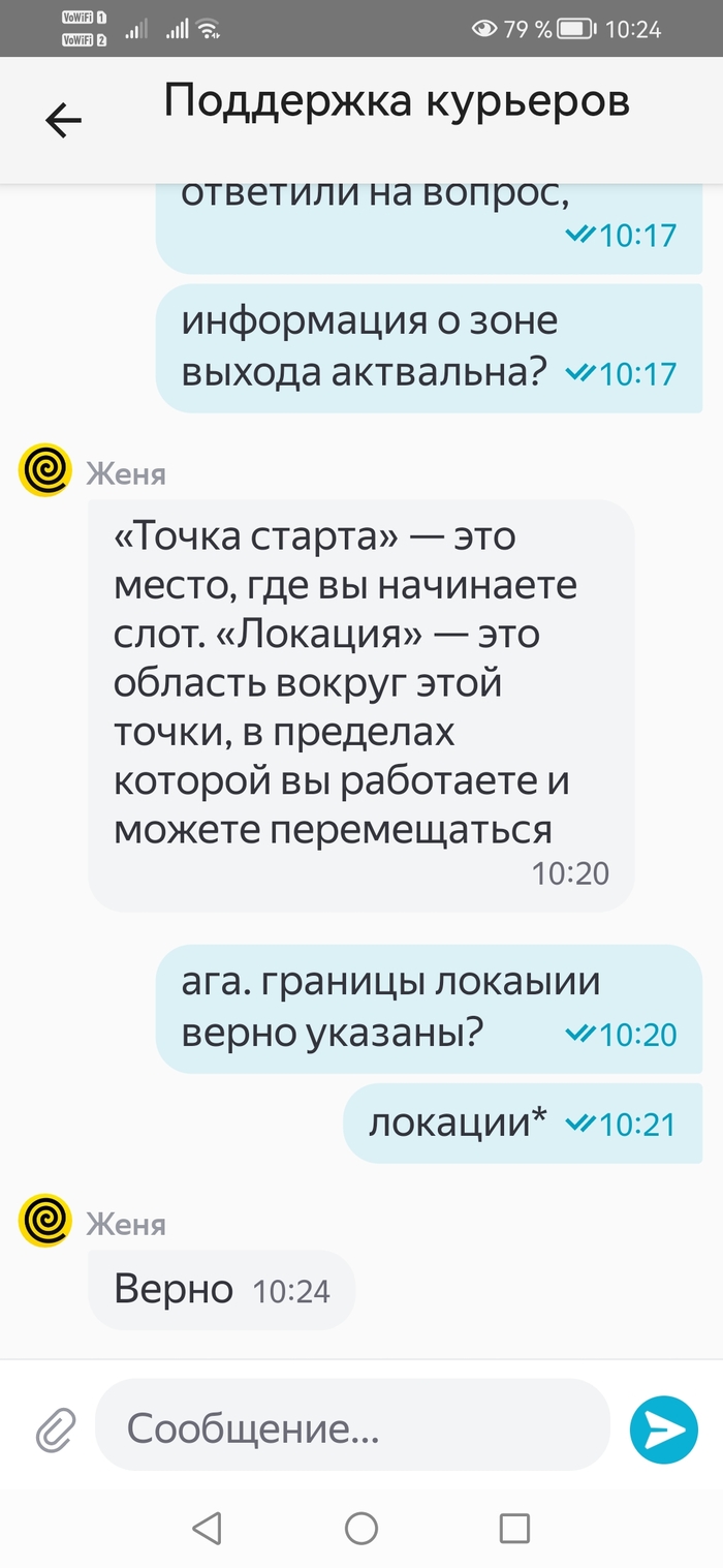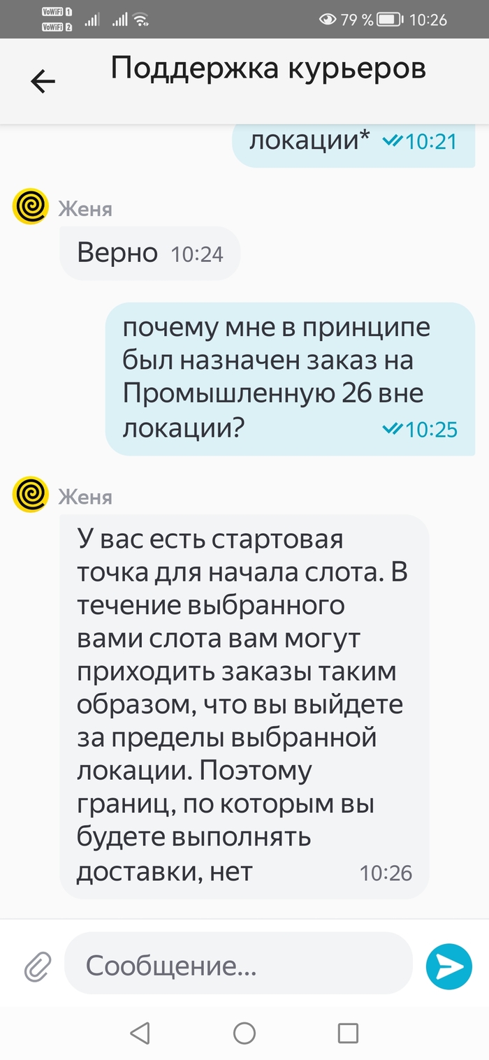 Поставлены вопросы о расстояниях, границах локации и почему заказ выдан за границу локации, хотя по определению "локация -- это зона, в которой вы будете осуществлять доставки". После вопроса о границах локации и просьбы оставить ссылку на публичную базу знаний чат лежит и не поднимается, поэтому какие успел скриншоты сделать, такие и оставил.