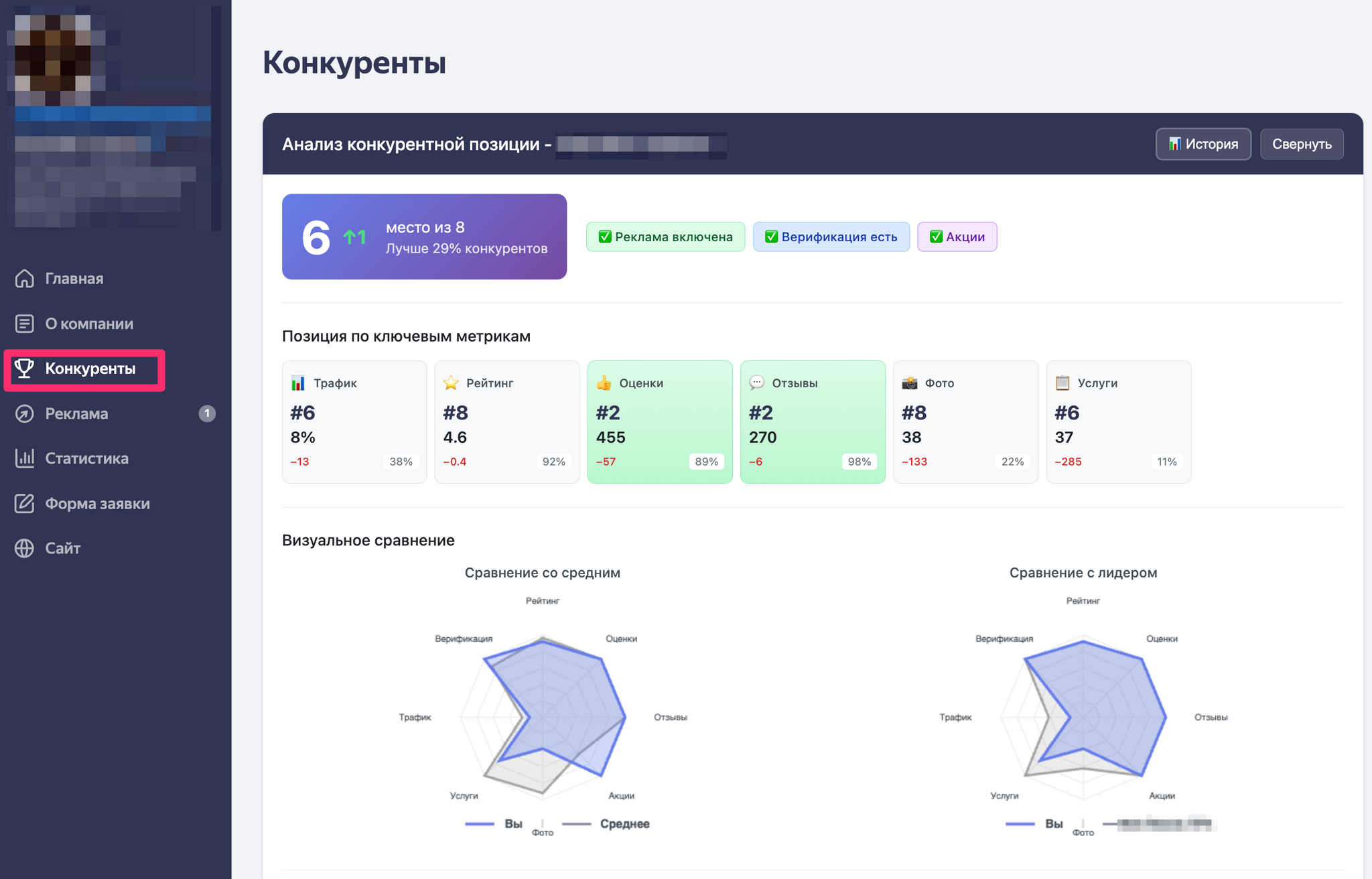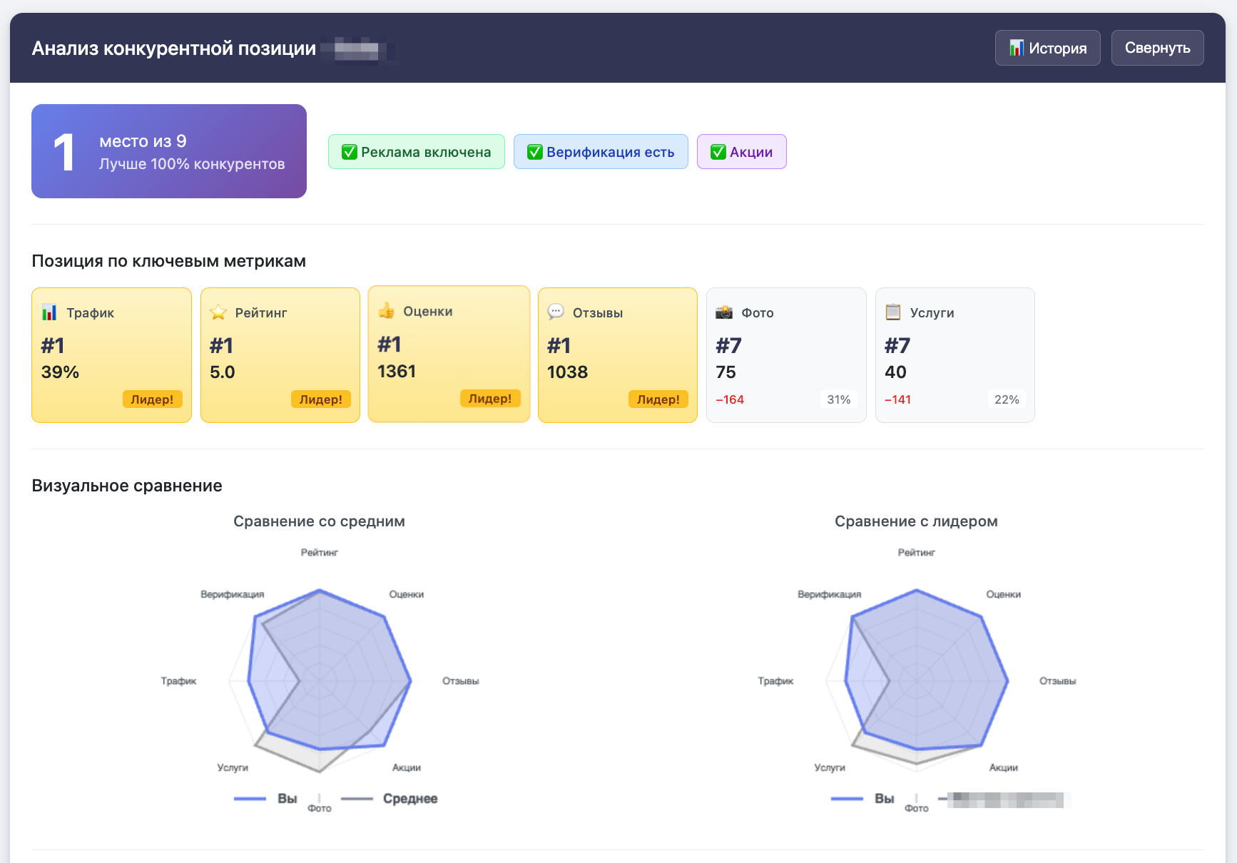 Мгновенную оценку. Вы сразу видите не просто место, а позицию по каждому ключевому параметру: трафик, рейтинг, оценки, отзывы, фото, услуги. Зеленые и красные индикаторы показывают, где вы молодец, а где нужно поднажать.